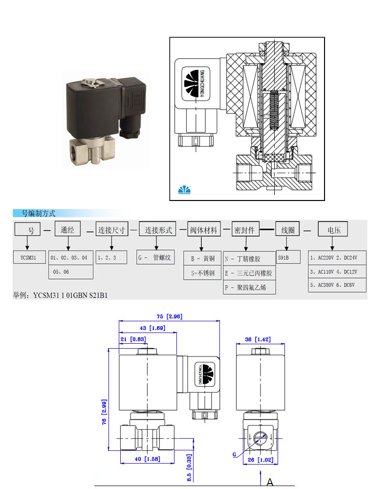产品特性: 直动式结构;开闭可靠,速度快;长寿命 使用介质: 空气、水、蒸汽、热水、真空及其它气体等 流体温度 NBR(丁腈橡胶):-10℃~80℃ PTFE(聚四氟乙烯):-20℃~200℃ EPDM(三元乙丙橡胶):-10℃~150℃ VITON(氟橡胶):-10℃~150℃ 工作压力: 0.0~1.60MPa 阀体材料: 黄铜或不锈钢sus304(可提供sus316材质) 连接尺寸: 1/8″、1/4″、3/8″G螺纹、NPT螺纹 通径(mm): DN1.6、2.5、3.0、3.5、4.0、4.5、5.0 选用电压: DC: 12V, 24V AC: 220V 110V 24V 50HZ 线圈类型: S91B/H,17VA(AC),14W(DC), IP65,100%ED ****************************************************************************************************************************************************************************************************************************************************************************************************************************************************************************************************************************************************************************************************************************************************************************************************************************