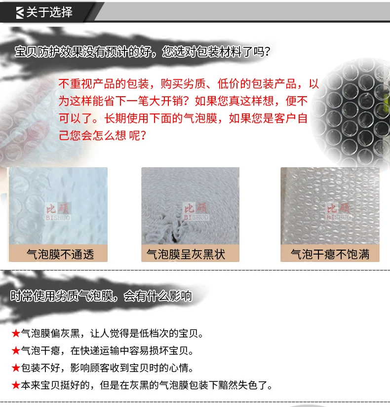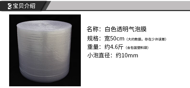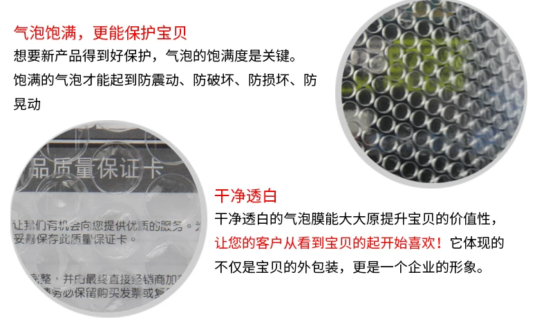 气泡膜不仅具有良好的减震性、抗冲击性、热合性,还具有无毒、防潮、耐腐蚀、透明度好等优点。完全可以替代发泡塑胶颗粒填充物之类的防护用品。