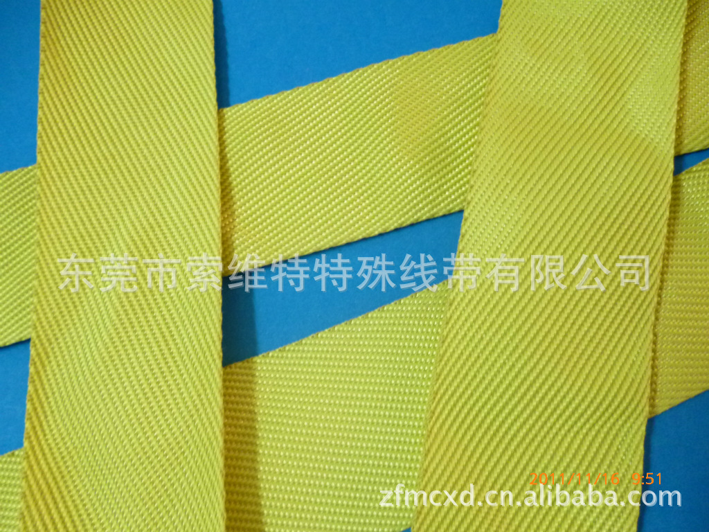 供应凯芙拉织带。KEVLAR防火织带,阻燃织带,芳纶织带。我司运用美国杜邦公司芳纶,该产品具有防火,阻燃,耐磨,抗高温,耐切割等功效,是目前全球防火效果最好的产品之一,颜色可按要求订染,宽度不限,欢迎各新老客户来电来函垂询,来图来样设计订做