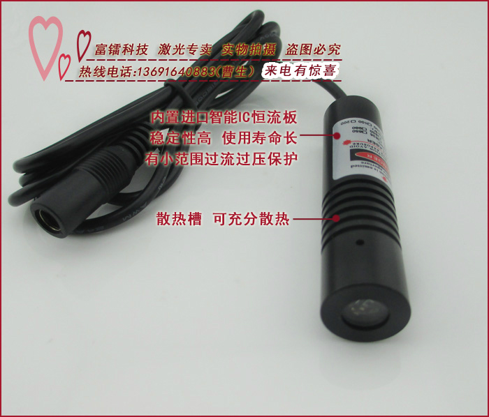 激光的发射原理及产生过程的特殊性决定了激光具有普通光所不具有的特点:即三好(单色性好、相干性好、方向性好)一高(亮度高)。利用激光的定向性好和高亮度,可广泛应用于医疗保健、军事、鉴伪、安防、舞台(红、绿、蓝)灯光、各种电动工具、测量类、仪器、设备、水平尺、定位仪、测距仪、测温仪、激光标线仪(投线仪)、各种板材切割成型机、石材机械、木工机械、金属锯床、包装机械的对刀、放线、服装类(缝纫机、裁剪机、自动手动断布机、开袋机、套结机、拉布机、绣花机、印花机、钉珠机、钉扣机、铆钉机、啤机)、电子工量具、鼠标、U盘、摄像机、手机、投影教学翻页笔、激光笔、工艺品、室内外装饰、手电筒、礼品类、玩具类等产品中。方便快捷、直观实用、易于安装、稳定可靠。能较大幅度的提高工作效率。