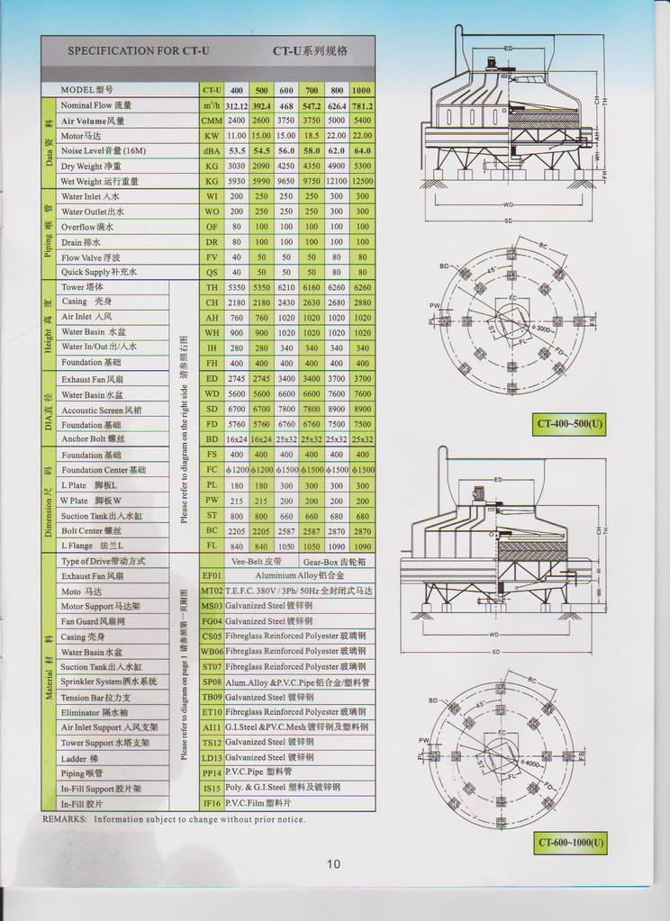菱电CT系列冷却水塔计3个型号,分别为标准型、低噪声型、超低噪声型。每种型号又分别有几十种规格,可满足不同水塔水量及不同用途的客户的使用要求。
