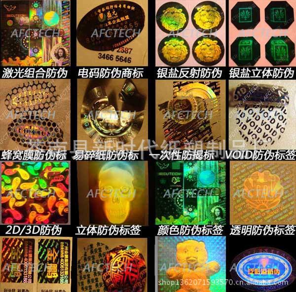 1.激光防伪标签 2.400/800数码查询防伪标签 3.定位烫印标签 4.银盐全息防伪标签 5.揭开留字防伪标签 6.2D/3D立体效果防伪标签
