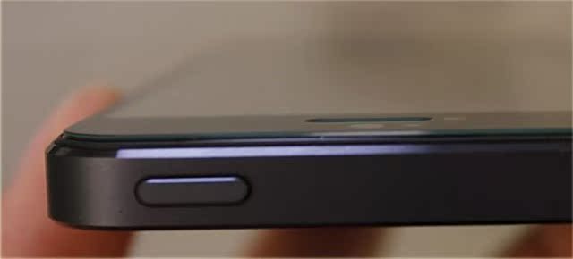 4.小心对齐IPHONE 5屏幕边线,将玻璃膜由按键处边沿慢慢倾斜放下玻璃膜,让膜慢慢接触IPHONE 5屏幕,这时玻璃膜会自动排气,慢慢贴合您的IPHONE 5屏幕。等玻璃膜完全排气完,注意观察IPHONE 5屏幕上有没有没完全排出的小气泡。要是有小泡可以用手指按除。