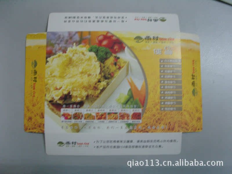 其配套便当盒纸盖采用三百二十克白图卡纸,内有食品专业耐高温淋膜或铝膜,可自定义LOGO(最少一万个起印)。盒盖上印刷自己的logo,订餐电话、菜名、无形中起到给自己店铺宣传的作用,让人过目不忘,这是其它快餐盒无法比拟的。一万个内:0.23元/个。