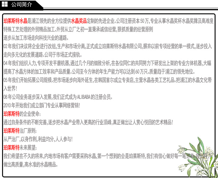 4,实力雄厚。我们从04年开始涉足水晶奖杯,水晶奖牌及办公礼品的定制加工,从最初的小规模单项刻面加工逐步走向今天系统化流水性的生产,积累了丰富的加工经验和人力资源。随着市场不断的深入开发,公司效益逐步攀升,我们没有驻足不前,我们不断的优化产品加工结构,提升产品质量,客户通过不断的积累,现在已经打破了浦江传统加工,独立分散的瓶颈!