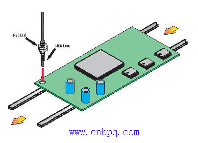 ■PCB板定位孔检测 目的:检测PCB板定位孔的有无 应用:在检测一个完全插装好的PCB板之前,PCB板需要精胡定位在某一处。定位孔或其他的定位标志一般是用来定位的。MINI-BEAM专家型塑料光纤传感器配合使用同轴光纤和镜头,在6mm的检测距离处光点仅为0.25mm,可检测很小的孔。 传感器:SME312FP 光纤:PBCT26U