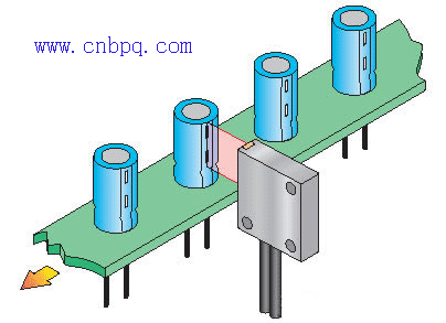 ■电容极性检测 目的:检测电容的放置方向是否正确 应用:由于电容是有极性的,所以当它被插装到PCB板上时需要检测其放置方向是否正确。 PBRS1X326U矩形光栅能检测到电容侧面的极性标识。对于D11E系列传感器,当没有检测到极性标识时会产生输出信号。 传感器:D11EN6FP 光纤:PBRS1X326U