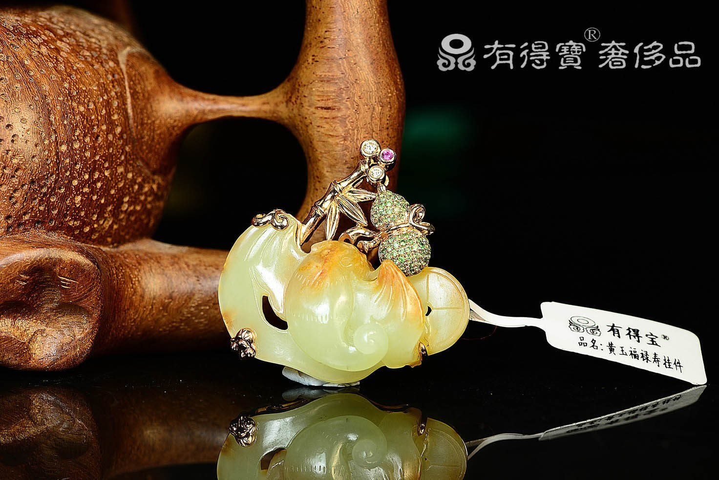 “葫芦”谐音“福禄”而中的“蝠”与“福”同音,因此有福寿双全,万事顺心的寓意。此物件精选上等黄玉,质地细腻油润,成色均匀,手感温润柔和;依俏色而雕一,用黄金、宝石打造一宝葫芦,工艺极为精美;整个作品线条流畅,给人圆润舒适之感。同时又蕴含美好寓意,实属上佳之作。