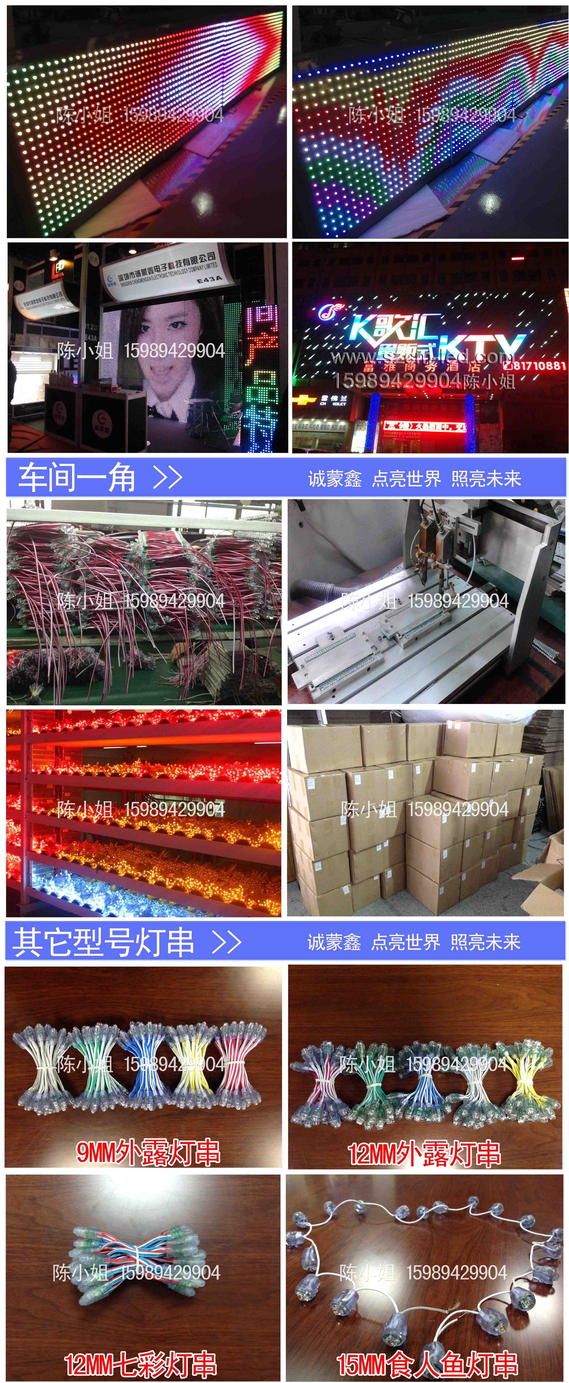 深圳市诚蒙鑫电子科技有限公司是一家集专业生产、研发、销售、服务为一体的LED生产厂家,专业生产LED户外产品: LED高亮度外露发光字、LED外露防水灯串、LED全彩灌胶灯串、LED贴片模组、LED食人鱼四灯模组、LED全彩点阵屏、LED护栏管、LED数码管、LED点光源,LED全彩贴片点光源、LED大功率洗墙灯等。LED室内照明产品:LED玉米灯、LED泛光灯、LED投光灯等,广泛适用于LED城市亮化和室内照明工程。