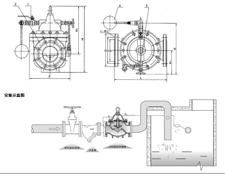 100X隔膜式遥控浮球阀是兼具多种功能的水力操作式阀门.主要安装于水池或高架水塔的进水口处.当水位达到设点的高度时.主阀由浮球导阀控制关闭进水口停止供水.当水位下降后.主阀由浮球开关控制打开进水口向水池注水.实现自动补水.液位控制精确.不受水压干扰.100X隔膜式遥控浮球阀可随水池的高度及使用空间任意位置安装.维护.调试.检查方便.密封可靠.使用寿命长.隔膜式阀门性能可靠.强度高.动作灵活适用于450mm口径以下的建议使用活塞式。