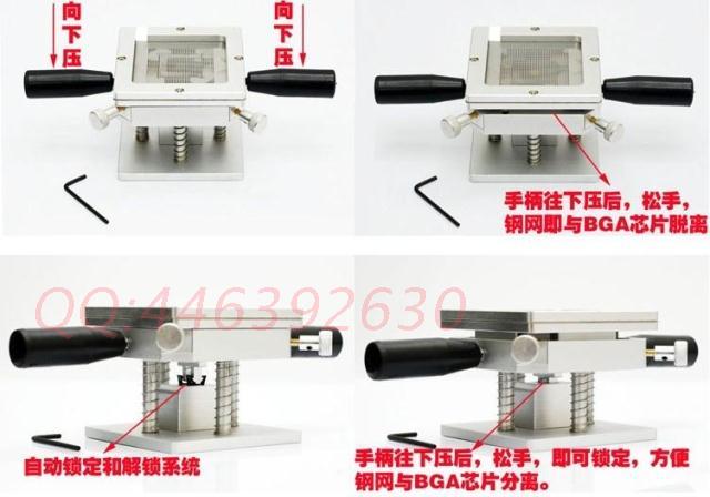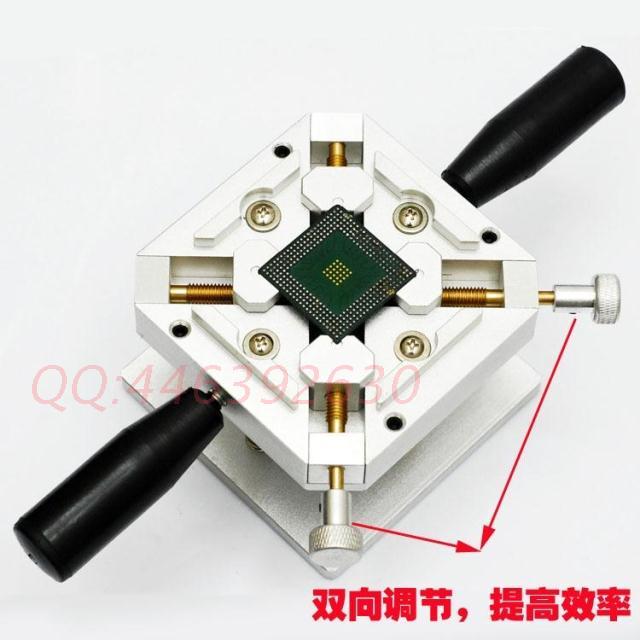 3、底座上有四个高度调整螺丝,可以根据不同厚度的IC来调整支撑滑块定位面与上盖上植球钢网间的距离,适用于不同厚度的IC植球