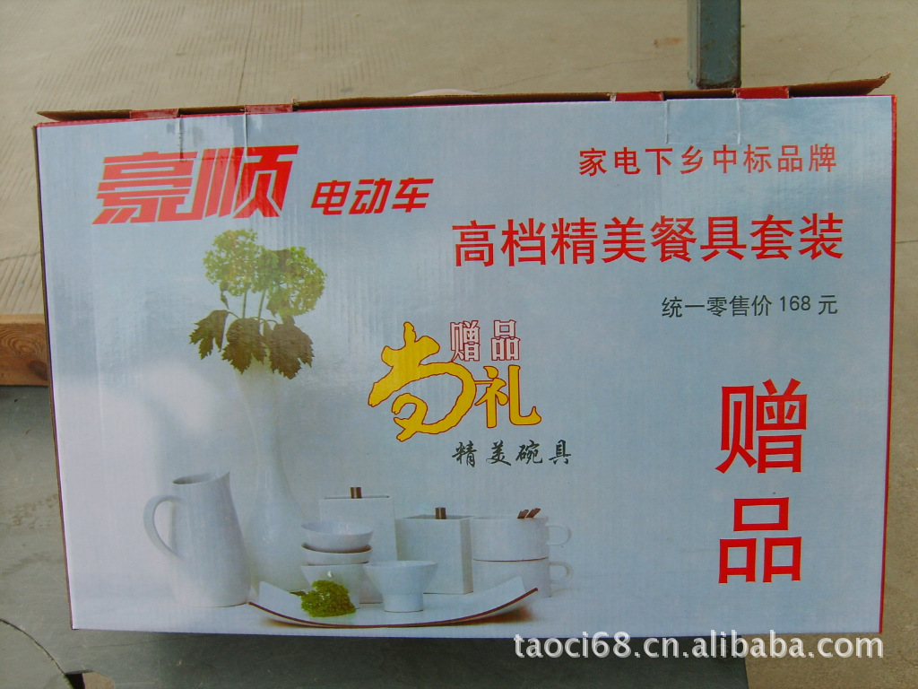 不同件数配置,不同档次(高档骨质瓷,中档镁质强化瓷和普通白瓷)的日用陶瓷餐具和茶具,已成为非常贴近百姓的上乘高档赠送礼品,并且也已被有远见卓识的大型企业和公司,作为一种促销方法而推广,且受到了很好的市场反应和回报。我厂生产的陶瓷餐具茶具礼品,多头搭配组合。各种花面,质美价优,请参考选购. QQ498722021 赵力争13070697100