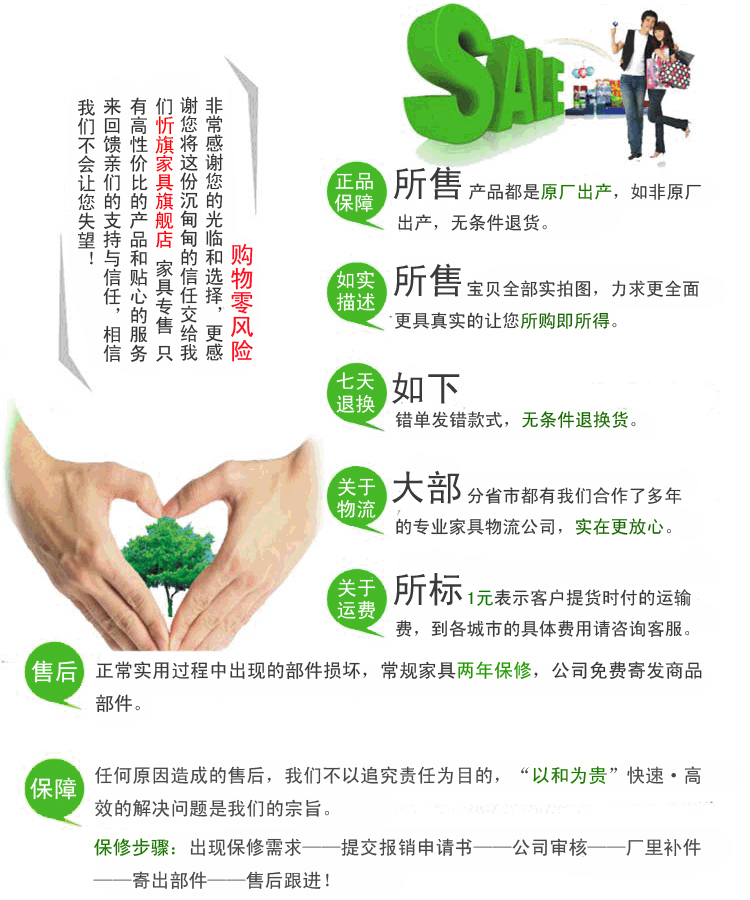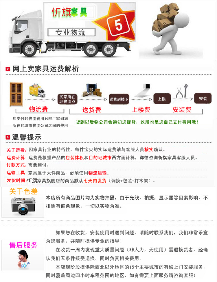 另:家具是大件商品,所以本店一般只针对上海地区客户,所以没有标注运费。外地客户可走物流(价格=商品价格+运输价格),拍前咨询客服,以免发生误会。走物流的客户收到货后一定要当着物流公司工作人员的面开箱验货,确认完好再收货,如果有损坏可拒绝收货,当着工作人员的面和我们联系,我们给您换货。因为我们发货都是很仔细的,(有问题的货物流公司物流公司会接吗)。也避免不了物流长途运输的损坏,当面验收就是有第三方证人。如果物流走后您才发现问题,我们是不能退换的。请亲们注意!