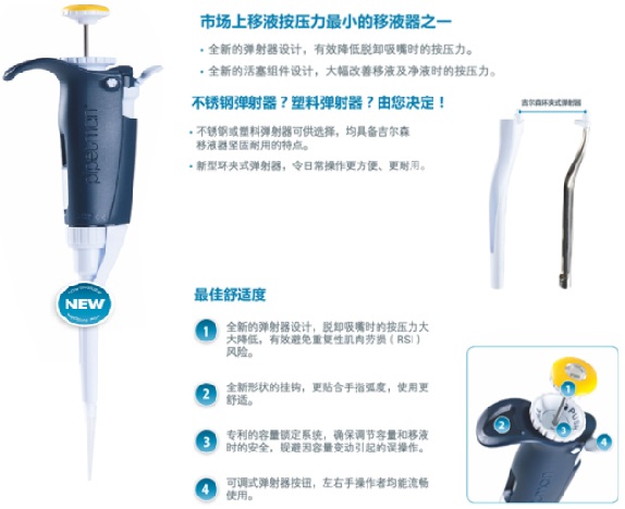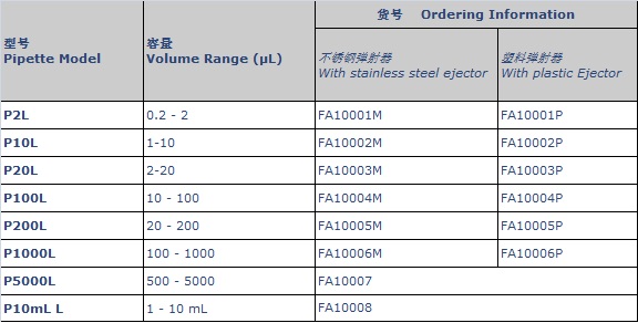 PH型单道移液器共有八种型号,容量覆盖0.2μL至10mL。