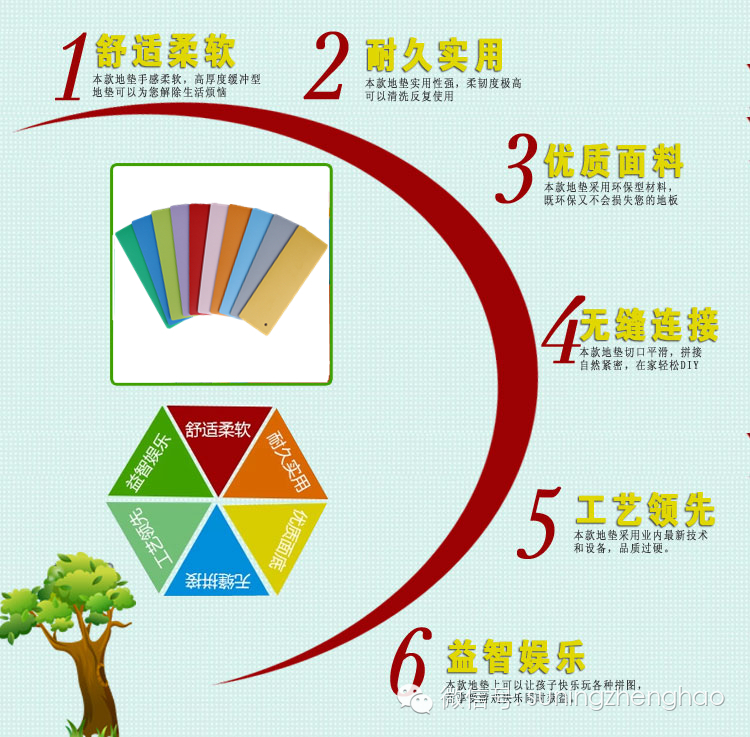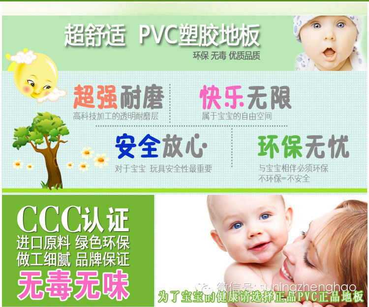 正浩全能王幼儿园地板由高档PVC制成,从根本上克服了传统的石材、地砖水磨石地材的冰、冷、硬、滑。表面温度经常在人体适宜范围,光脚行走在地板上面,也会感觉到温暖如春,舒服亲切,当然最重要的一点是环保,我们也都知道,医院用的输液管,平时喝水用的塑料杯子这些都是pvc做的,而且也都非常的环保,同样这种幼儿园地板也都是这种pvc制作而成的,所以根本就谈不上会释放甲醛问题。当然还有一些使用者会问,如果下面有地暖的话,地板也会变热,会不会再变热的过程中释放甲醛?在这里笔者也可以做一下解释,首先我们设想一下,如果pvc一预热就会释放甲醛,那么我们平时就不能喝开水了,因为我们用塑料杯子喝的全是甲醛了,呵呵,所以完全不用担心会有甲醛。