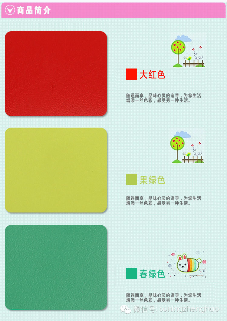 颜色:玫瑰红、桔子橙、苹果绿、葡萄紫、蜜桃粉、柠檬黄、天蓝等十种颜色