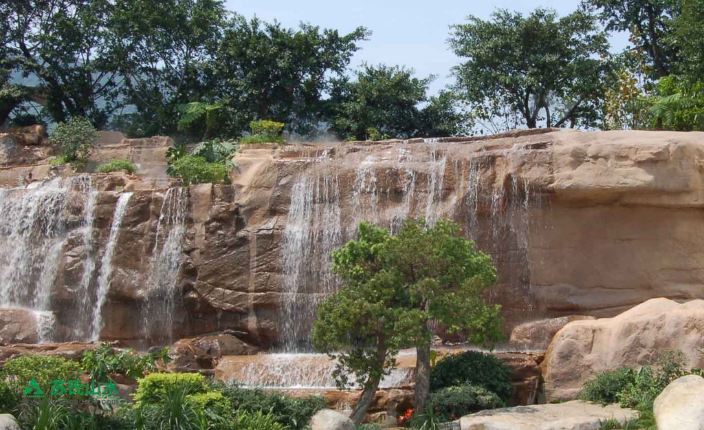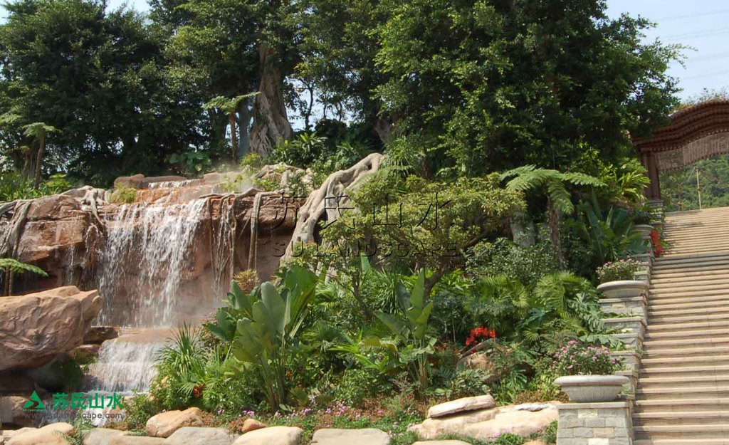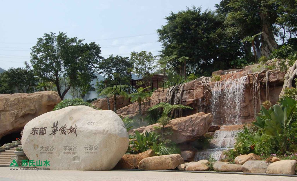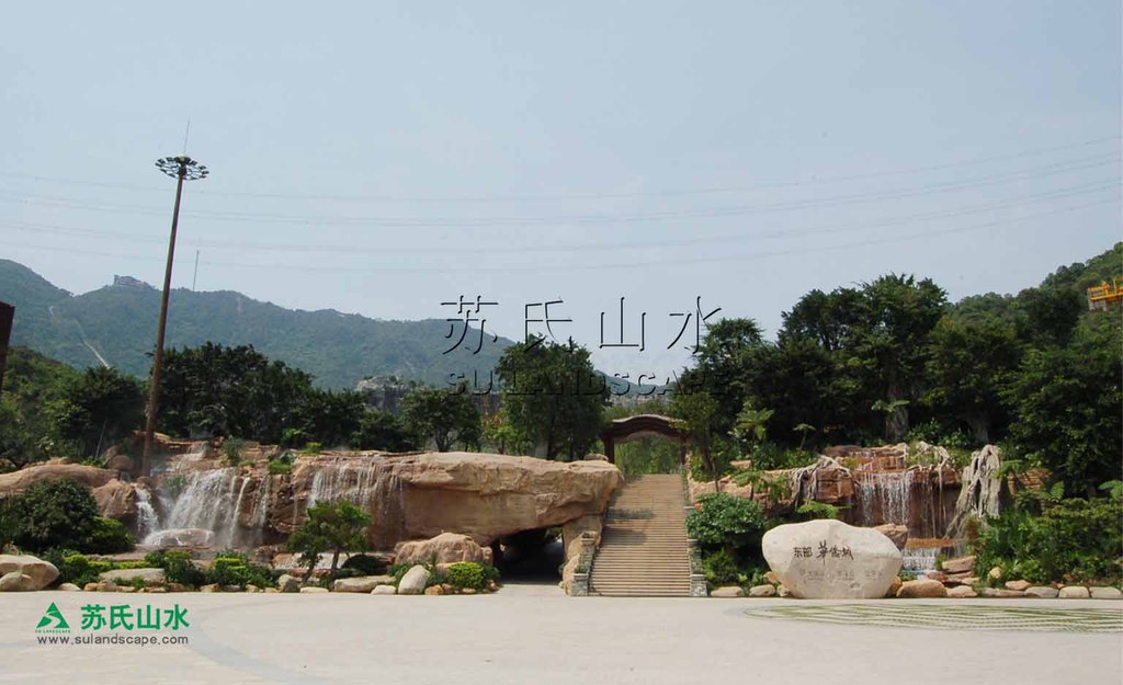 流之远者,浚其泉源。苏氏山水在大峡谷前广场浚通了水之“泉源”。在建造广场的时候,距广场一里开外耸立着一条壮观磅礴的大瀑布,苏氏山水创造性地将这条分属于不同水系统的瀑布纳入自己的创作图画中,画面遽大,境界遂高。此时,青天碧海的东部华侨城,海天一体,天地成画,天际线为远景,大瀑布为中景,广场瀑布为近景。在这幅画面中,流水是主线,瀑布从天际线涌出,经大瀑布跌落,在崇山峻岭中蜿蜒,又到达画面的中心-----大峡谷前广场,最后汇入波涛浩渺的深圳湾,可谓源远流长。