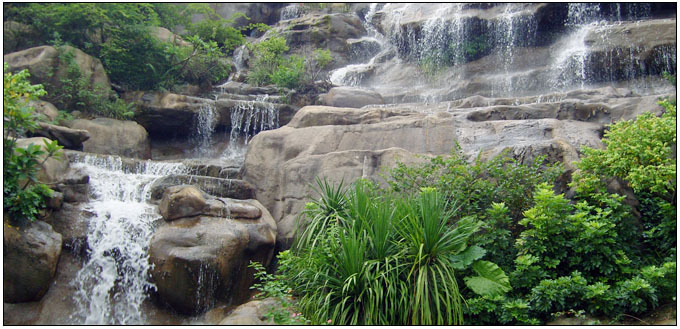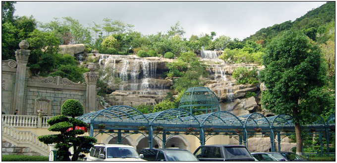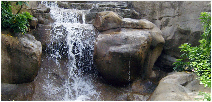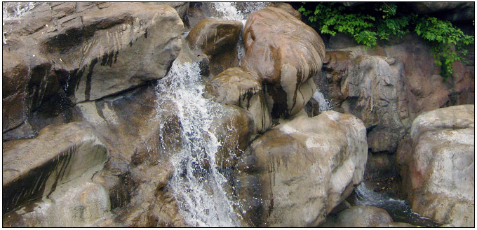 在因特拉根酒店前面的假山流水图景中,绿树掩映在山石之间,大大小小的流水弯弯曲曲自山顶流出,从绿树叶中穿过,体现出委婉、悠长、深邃、幽怨的美感。曲水的美感不仅在于姿态的悠闲自若、娇柔婉转,更在于这种姿态能传达出的,余音袅袅、不绝于缕的幽怨意境。