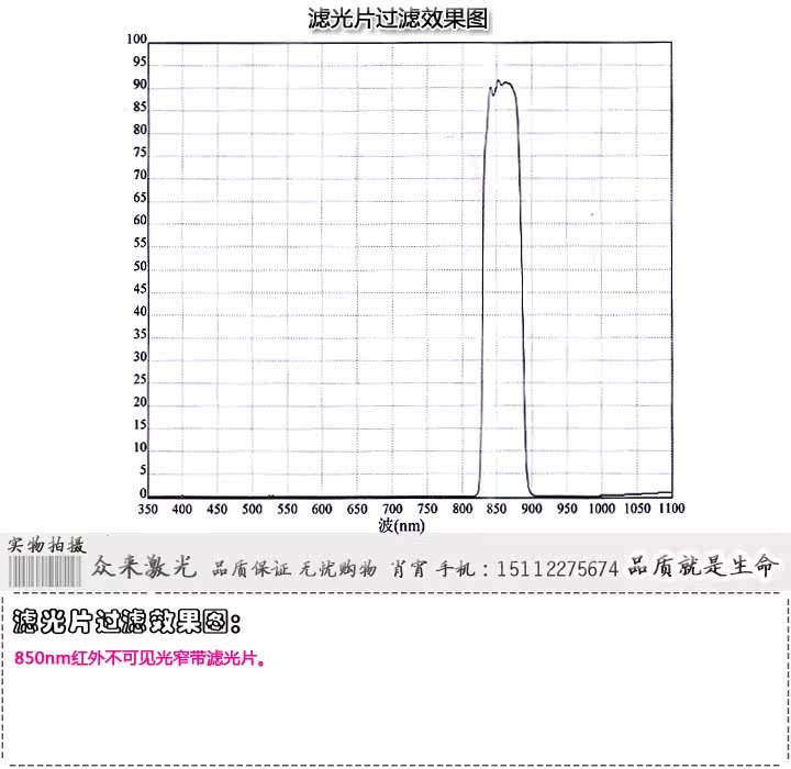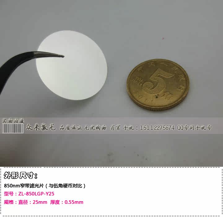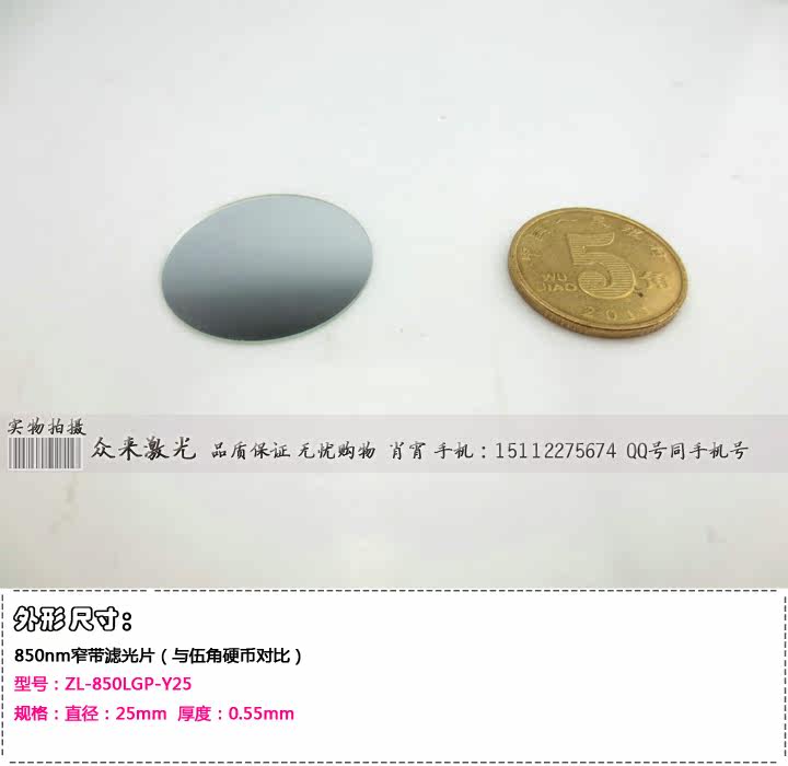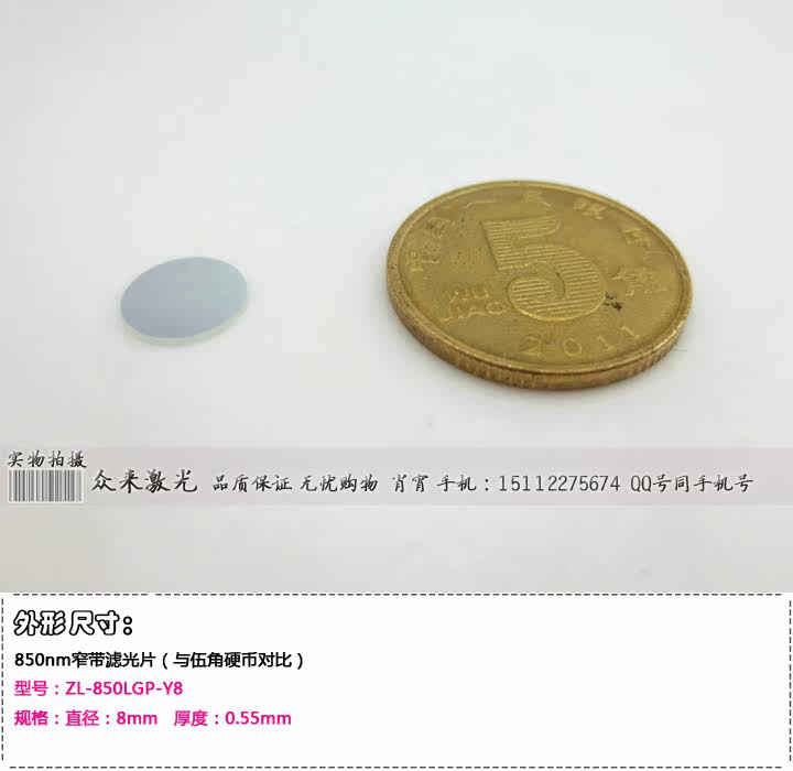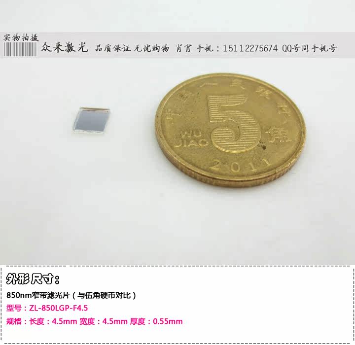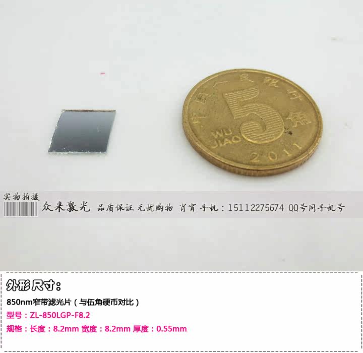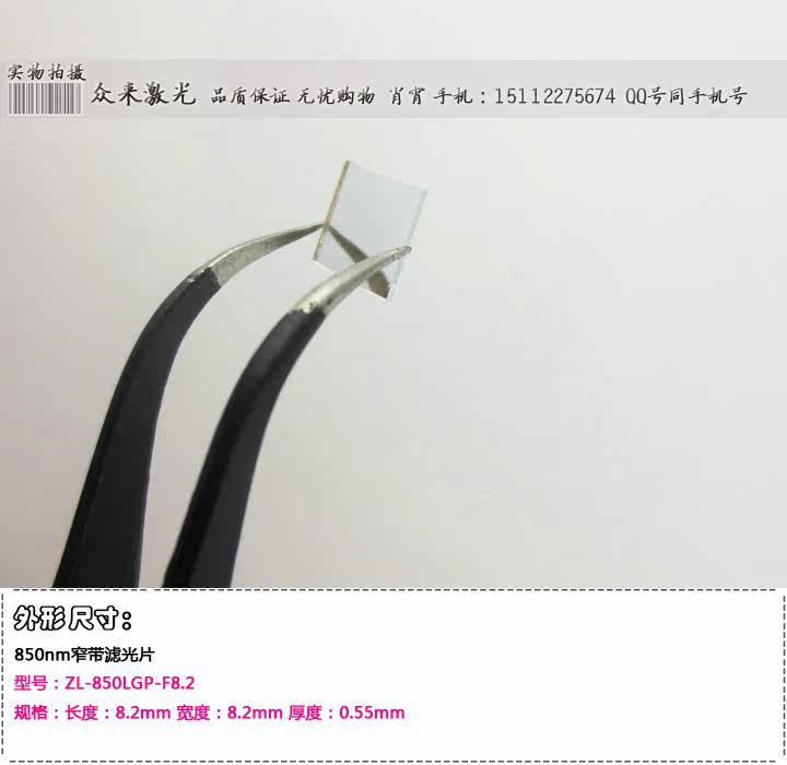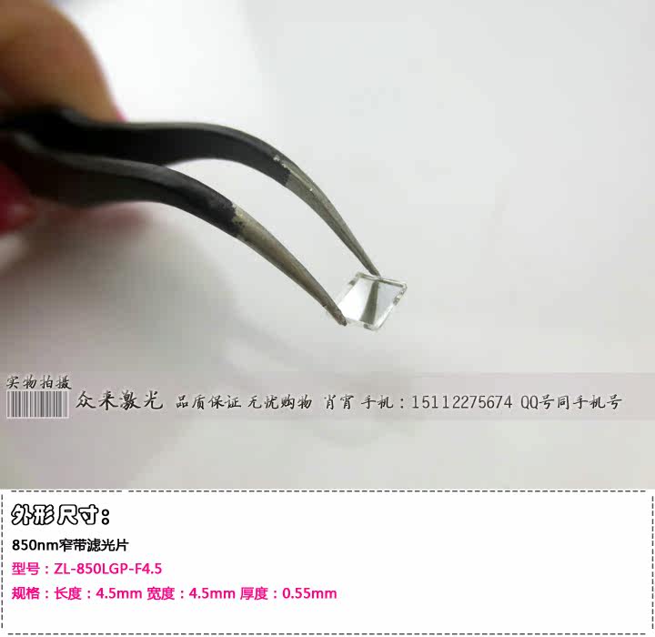 名称:850nm红外光窄带滤光片四种规格尺寸可选:型号:ZL-850LGP-F4.5 规格:长度:4.5mm 宽度:4.5mm 厚度:0.55mm-----20元/片型号:ZL-850LGP-Y8 规格:直径:8mm 厚度:0.55mm--------------------25元/片型号:ZL-850LGP-F8.2 规格:长度:8.2mm 宽度:8.2mm 厚度:0.55mm-----25元/片型号:ZL-850LGP-Y25 规格:直径:25mm 厚度:0.55mm--------------------80元/片