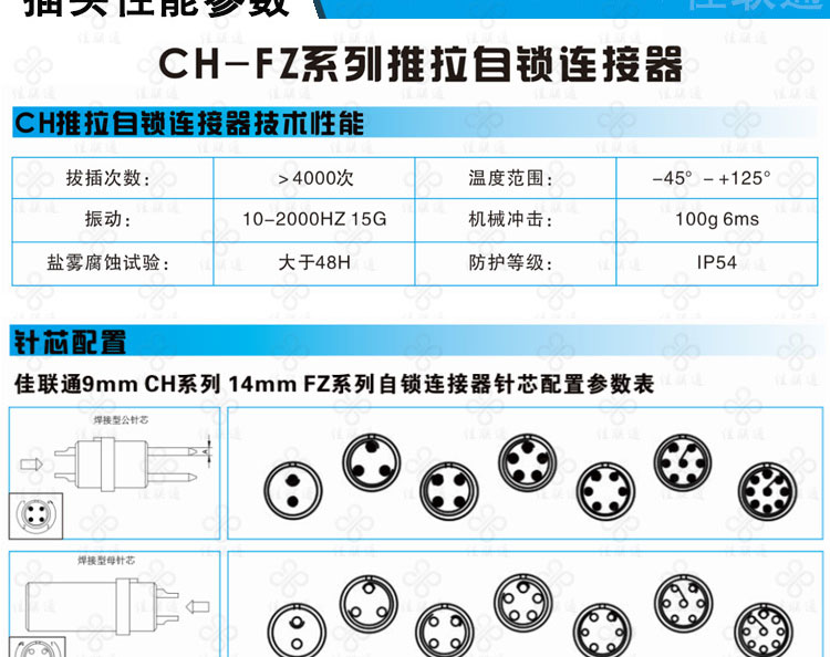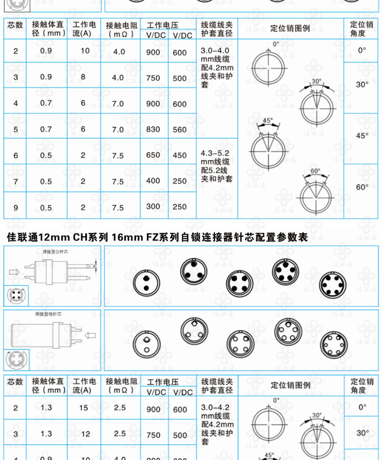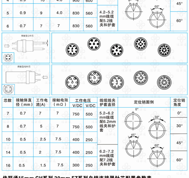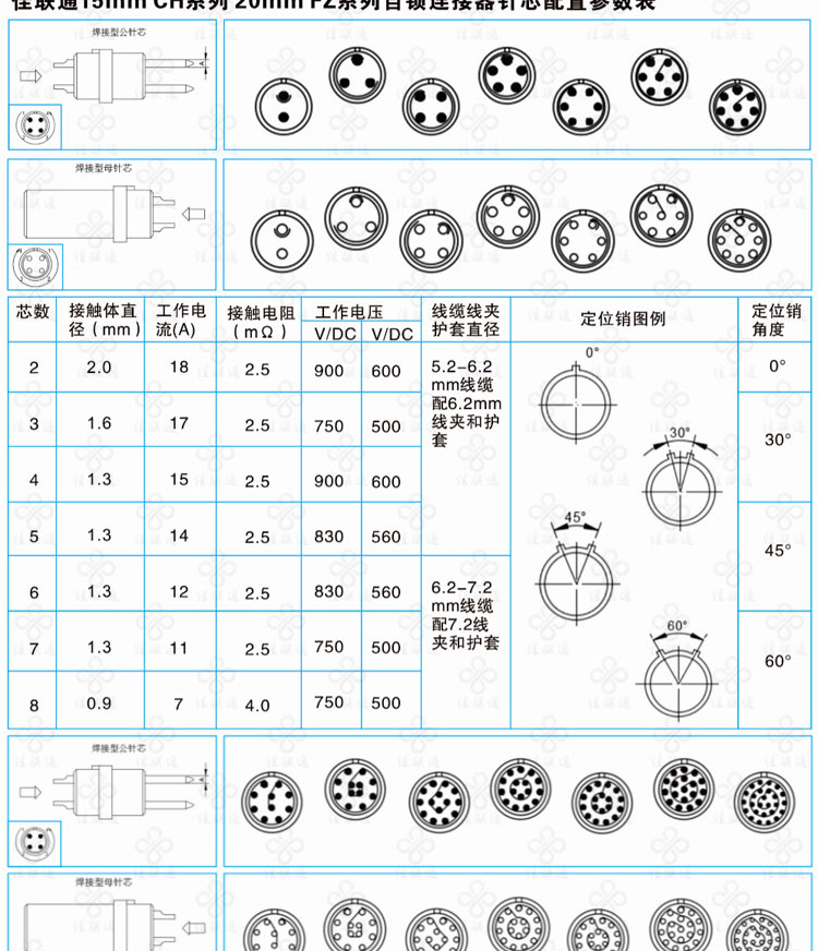 根据不同大小插座安装开孔尺寸,具体芯数: 9mm开孔:2 3 4 5 6 7 9芯 12mm开孔:2 3 4 5 6 7 8 10 14 16芯 15mm开孔:2 3 4 5 6 7 8 10 12 16 19 26芯 佳联通CHZP系列圆形自锁连接器广泛应用于通讯、电子、检测与测量、机械设备、医疗器械及仪器仪表等行业;特别适用于需频繁连接分离、需屏蔽的仪器仪表及设备上的电连接。
