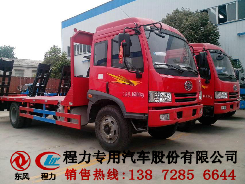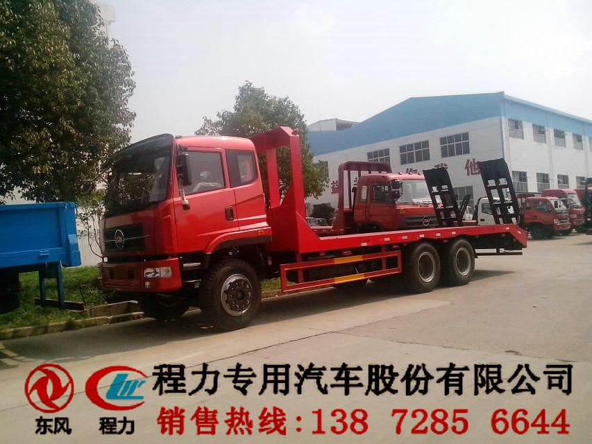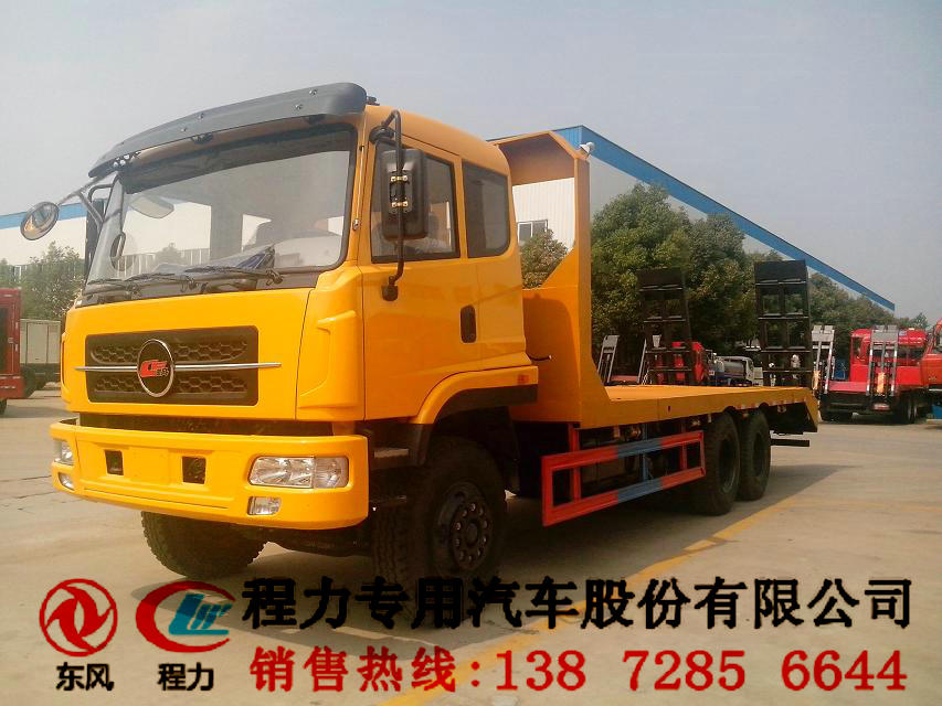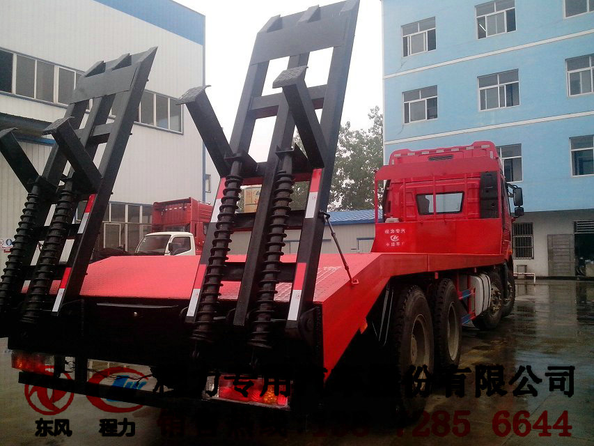 公路路面机械、摊铺机、铁铣机、压路机以及工程履带设备等各种公路、市政、建筑大型施工机械设备的转场运输。它具有灵活方便、自主上下(各履带式工程设备可自行上下平台,无需其他任何起吊设备及辅助工具)、升降自如(跳板采用内隙自调液压增力式装置,可自行升降)的特点。首次采用串联式平衡悬挂,运输道路无论平整、凹凸,悬挂系统都能均衡受力,从而保证了车辆在运输过程中安全无损坏。安装防滑条,保证被运输车辆的安全性。各种不同宽度的工程履带设备均能上下。东风多功能平板运输车省时、省钱、方便、快捷,是名副其实的“转场大王”。尺寸主要解决现有的多功能货物运输车装卸大型工程机械和油田设备时困难、装卸长条型。