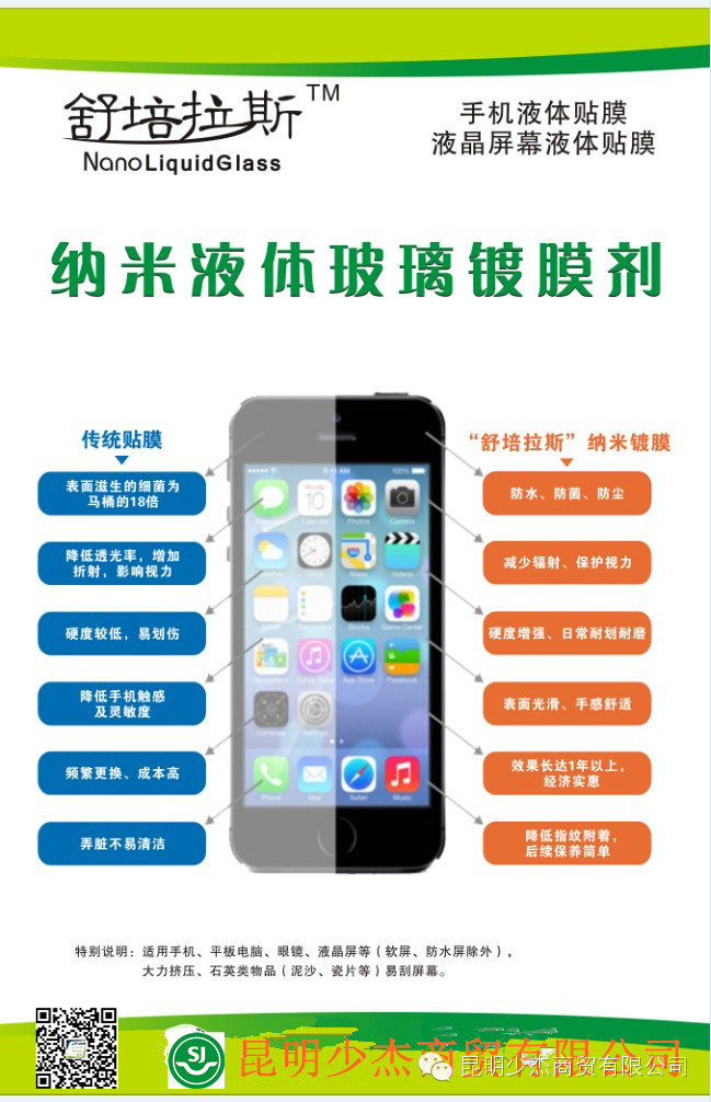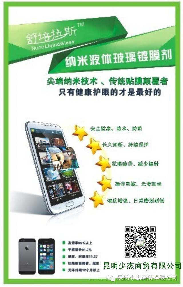 采用最新纳米级尖端技术,应用在手机屏幕、液晶显示屏、眼镜、汽车玻璃、玻璃幕墙等领域,能起到防尘、防水、防污、防菌、日常耐磨损、抗紫外线、减少辐射的作用,是传统塑料贴膜领域的革命性替代产品。