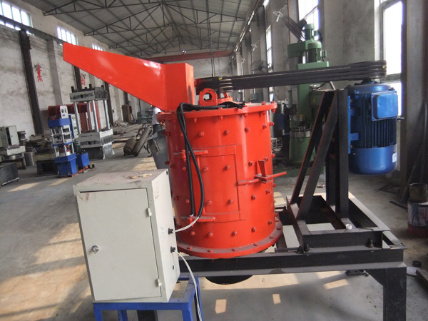 物料由机器上部垂直落入高速旋转的叶轮内,在高速离心力的作用下,与另一部分以伞状形式分流在叶轮四周的物料产生高速撞击与粉碎,物料在互相撞击后,又会在叶轮和机壳之间以物料形成涡流多次的互相撞击、摩擦而粉碎,从下部直通排出,形成闭路多次循环,由筛分设备控制达到所要求的成品粒度。