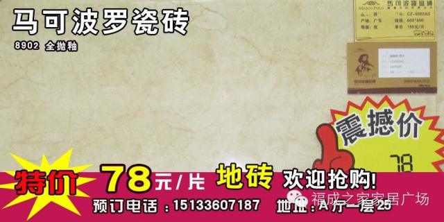 来福成家居建材城买家具建材价格实惠有保障!“福成家居建材城,您购物 我担保”是我们永恒的服务宗旨。马可波罗瓷砖专卖店推出特价产品: