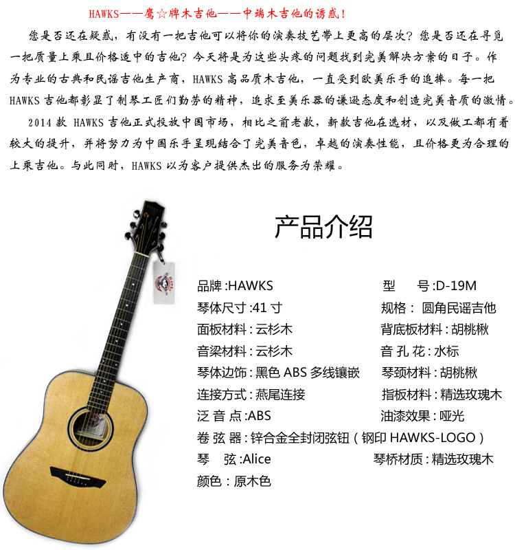卓韵乐器 正品鹰牌HAWKS D-19M圆角民谣吉他 41寸云杉木吉他