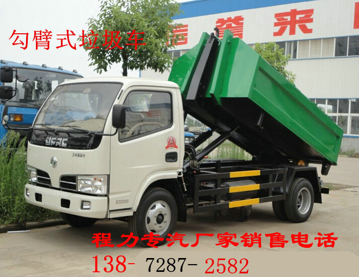 勾臂式垃圾车又称车厢可卸式垃圾车。上装部分由:拉臂主油缸、附车架、翻转架、支撑腿(选装)、锁紧架、锁紧油缸及多路换向阀等组成。一车可配备多个垃圾斗(分为船形斗、方形斗,),实现与多个地点的垃圾斗联合作业。垃圾斗后盖为可向上打开的活动门,并用4个锁紧栓锁紧(防止在垃圾运输过程中垃圾厢内的垃圾撒在路面上造成二次污染),打开锁紧栓可将厢内垃圾一次性自卸出来,完全液压操作,使用方便,操作简单。该车广泛适用于城市街道及学校垃圾的处理。有特殊要求的用户可根据用户要求进行适当改装。