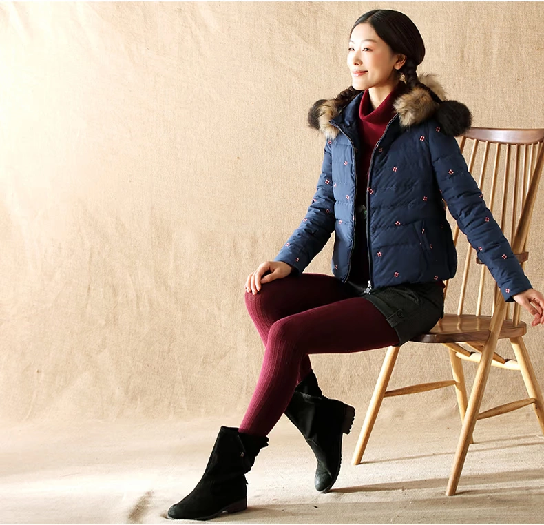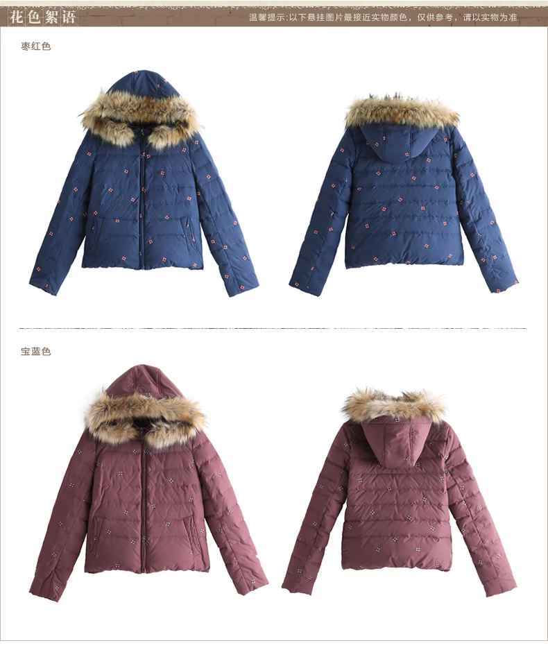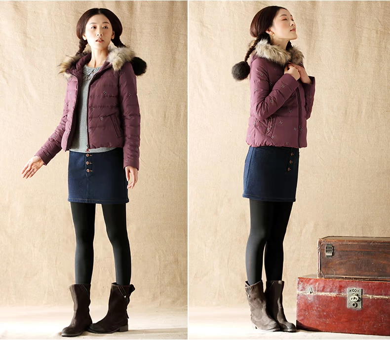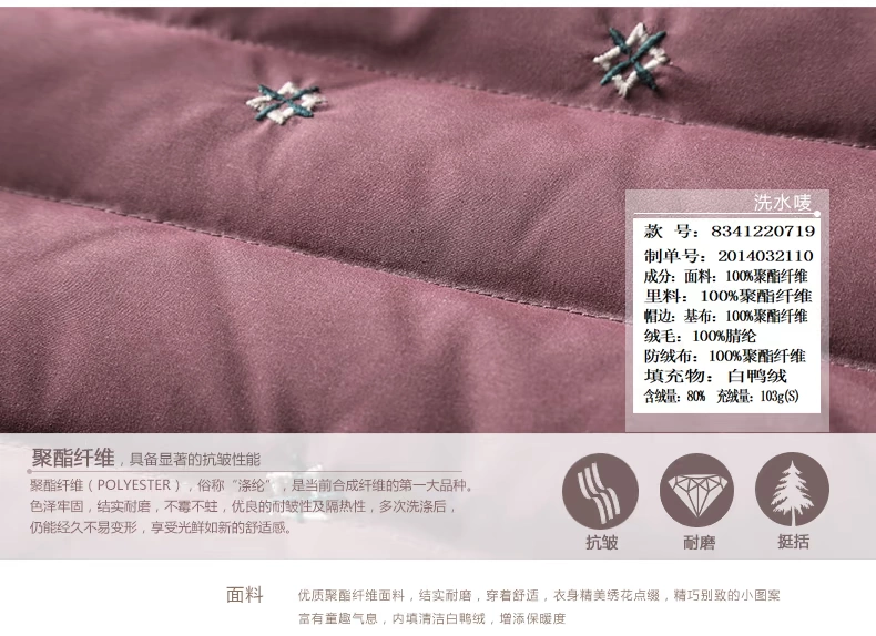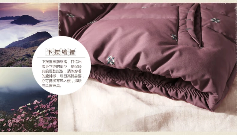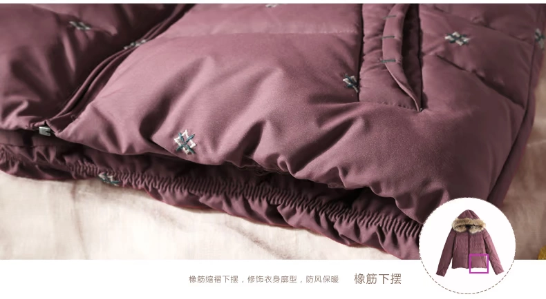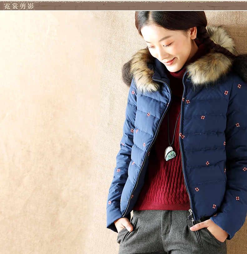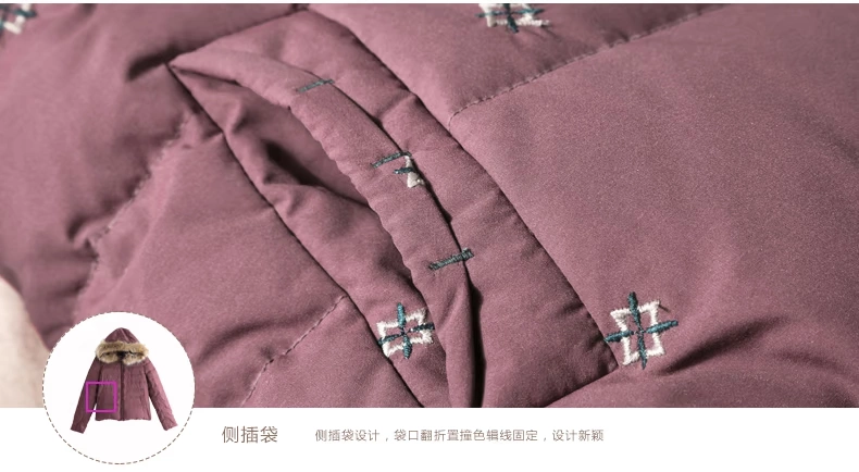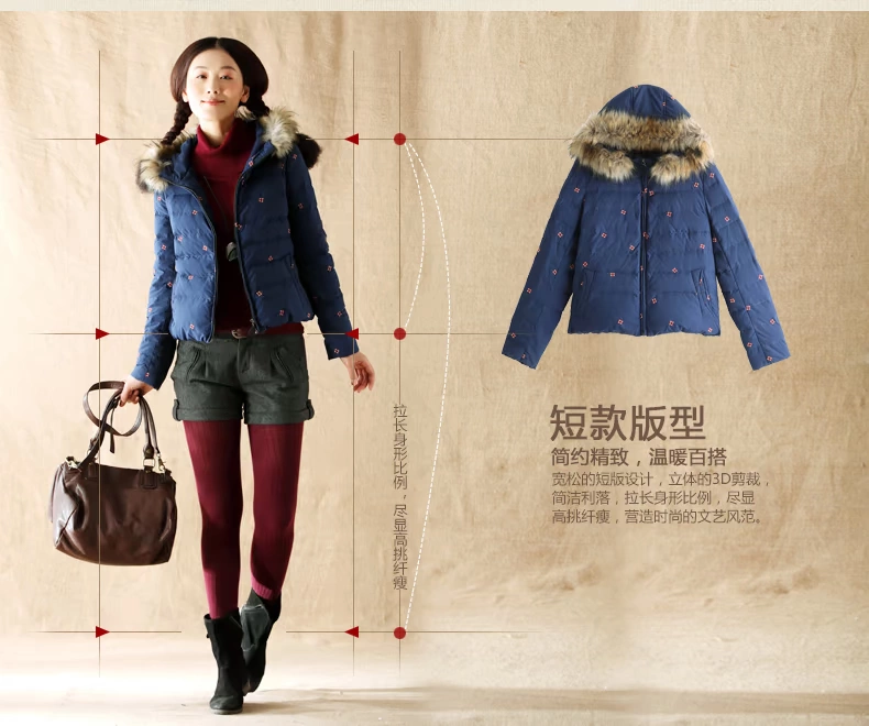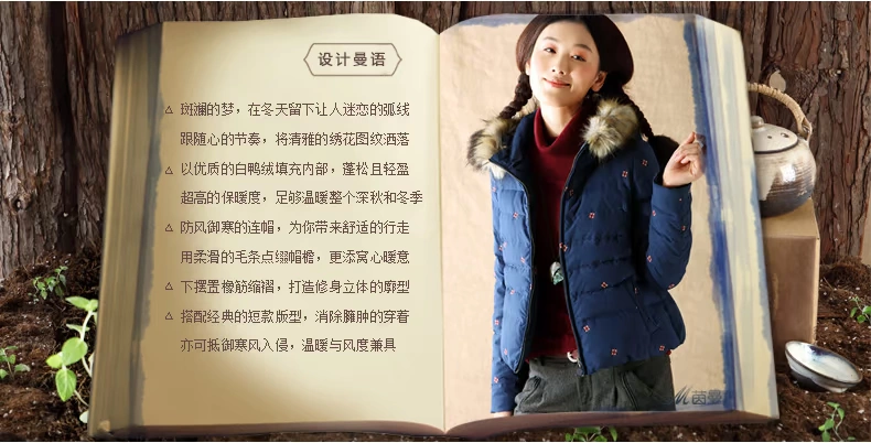 茵曼2014冬新款文艺衣身绣花毛领连帽保暖羽绒服女8341220719