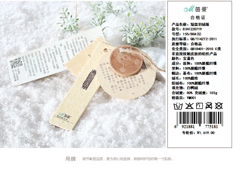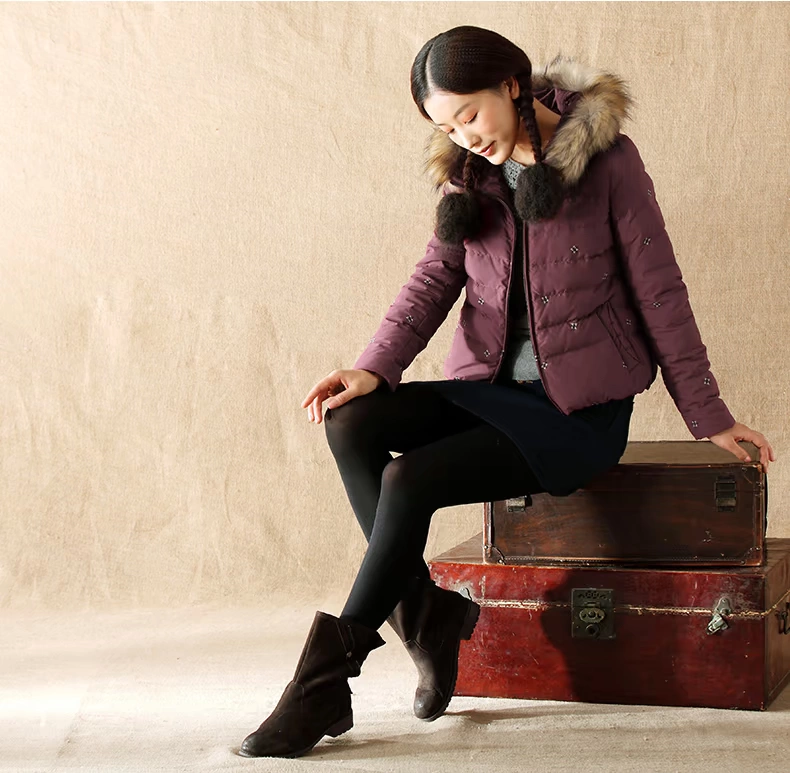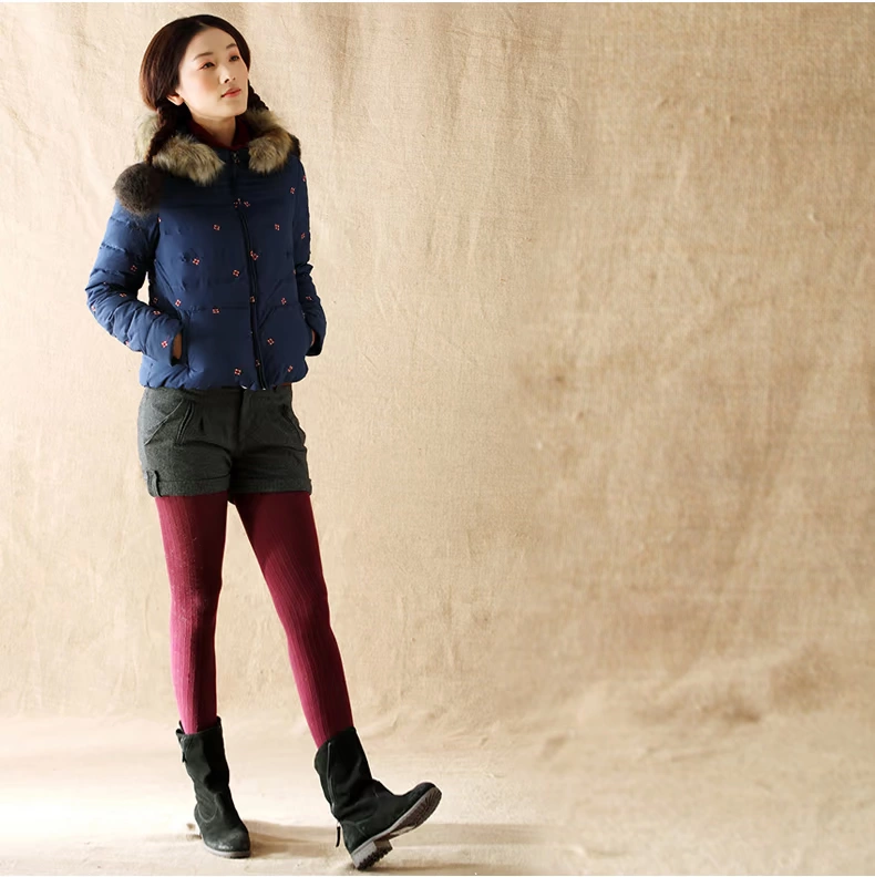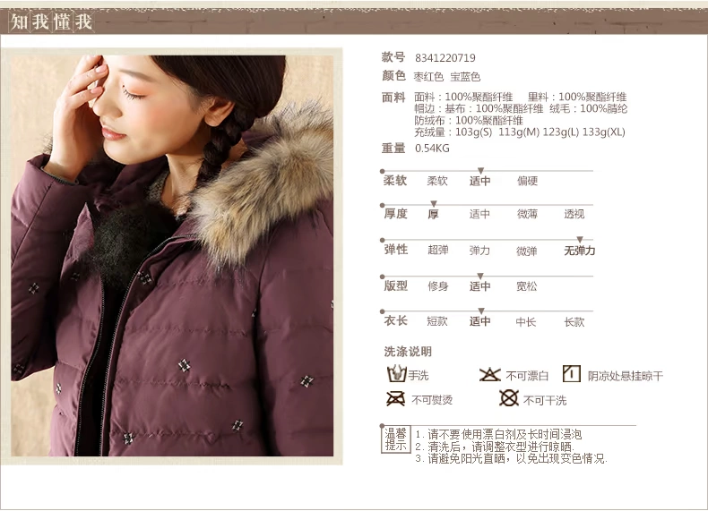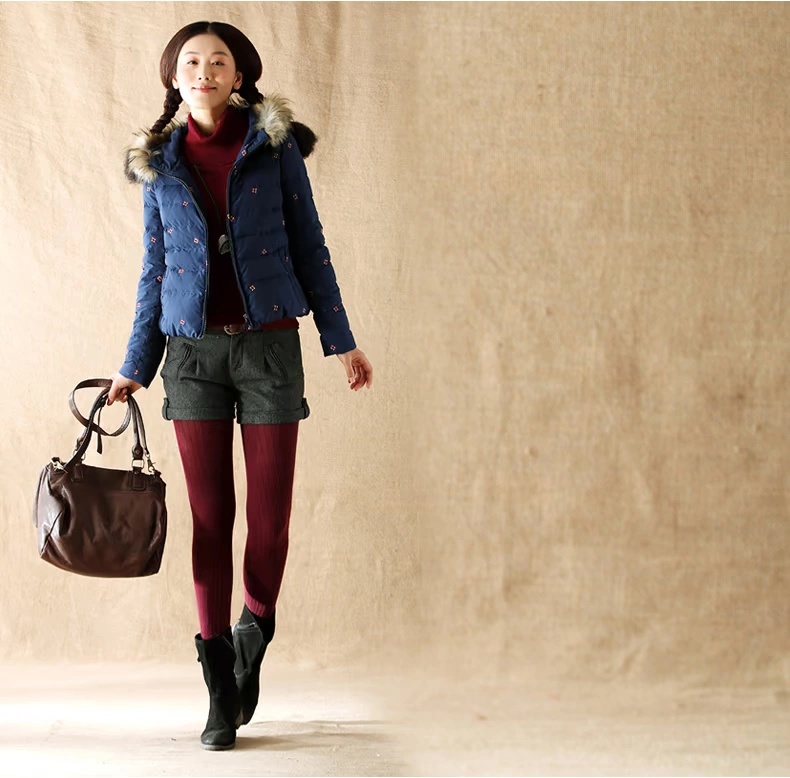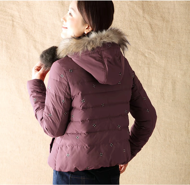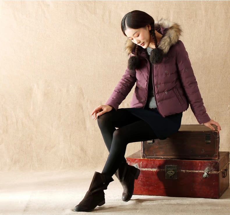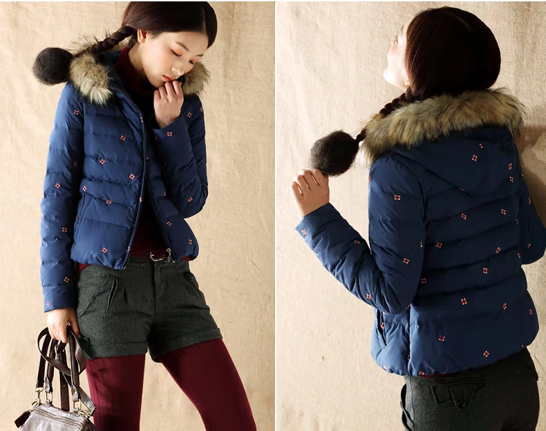 茵曼2014冬新款文艺衣身绣花毛领连帽保暖羽绒服女8341220719
