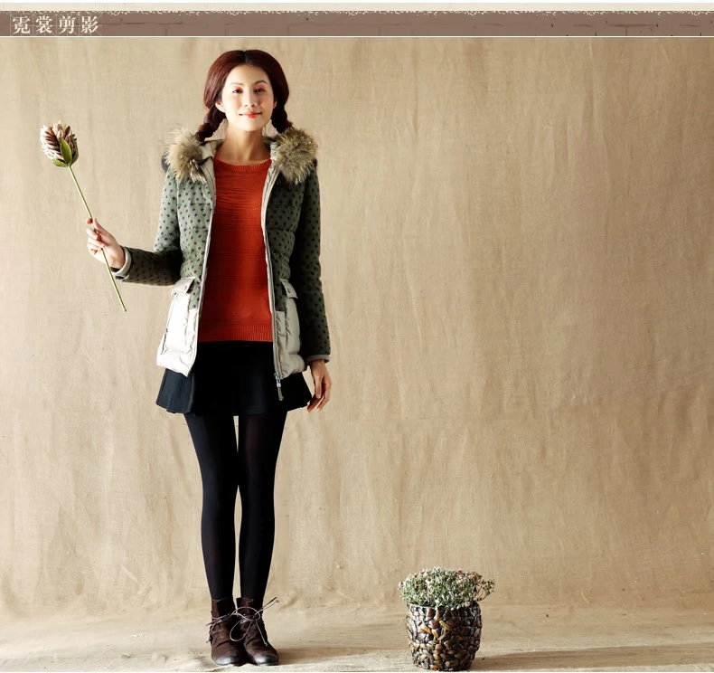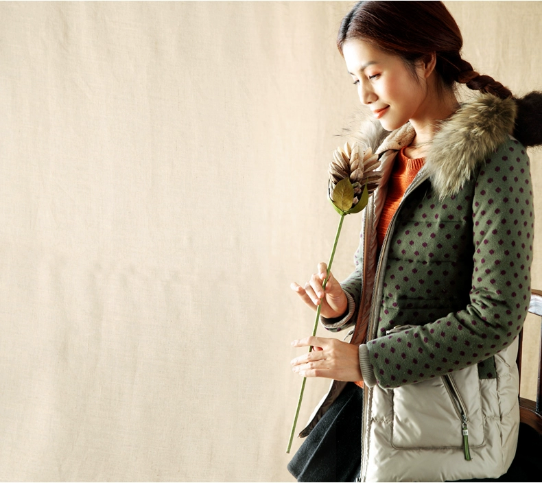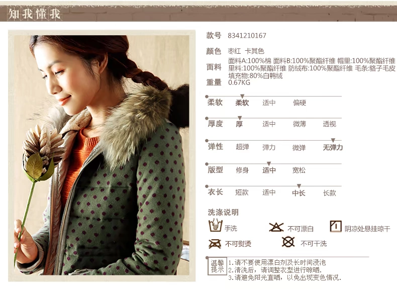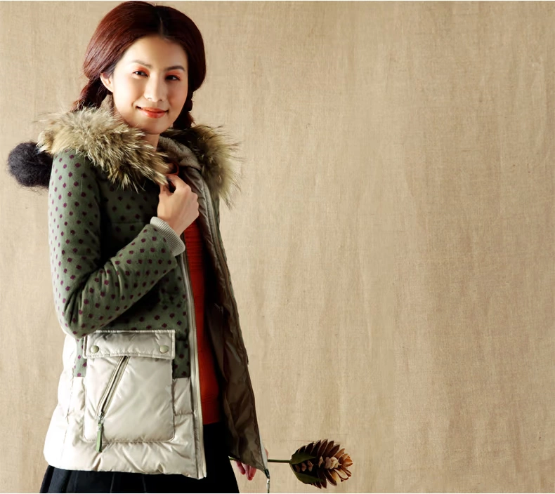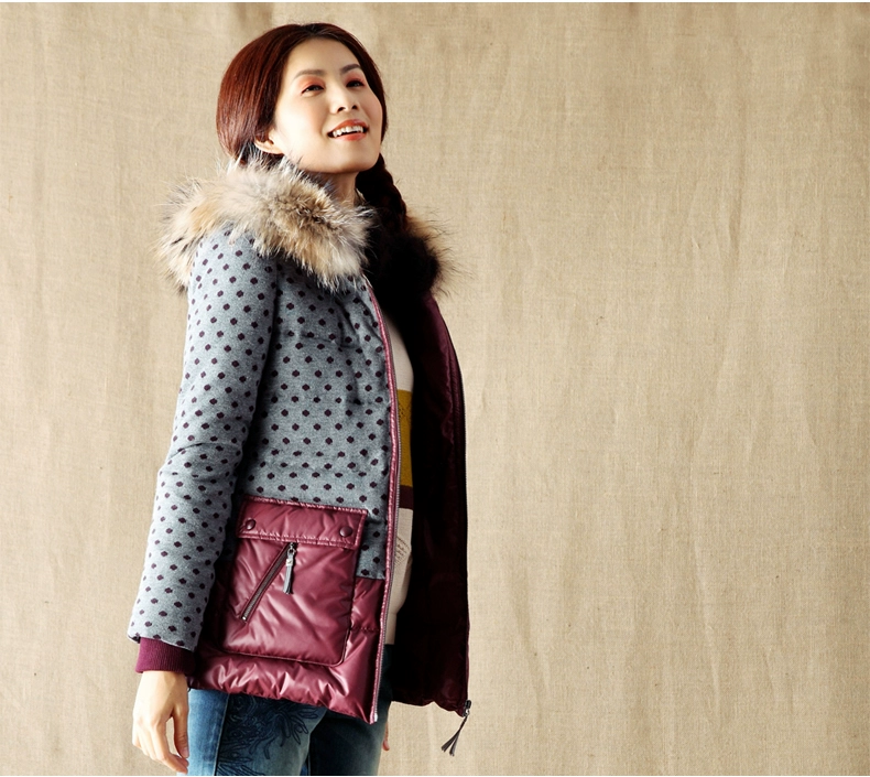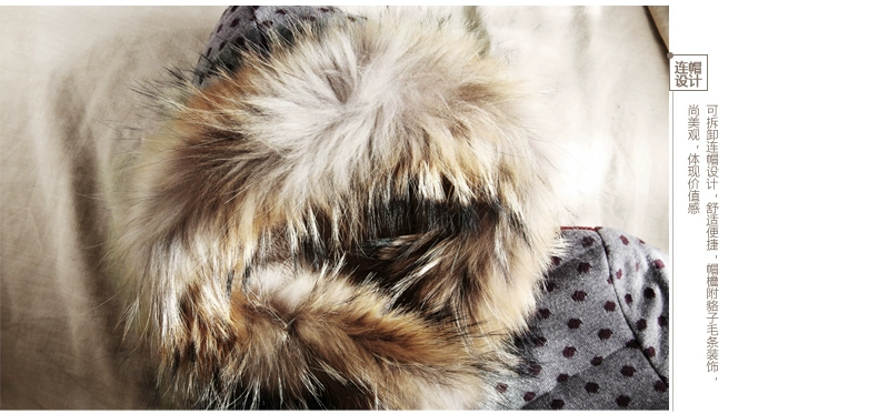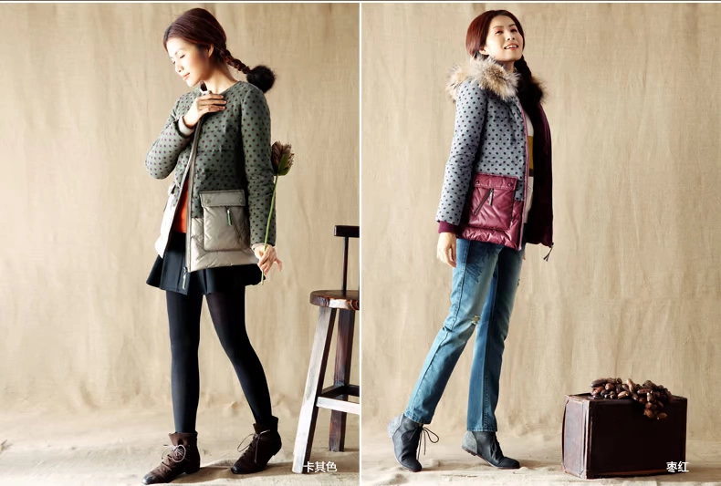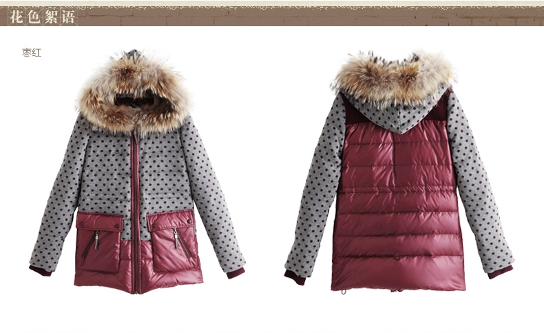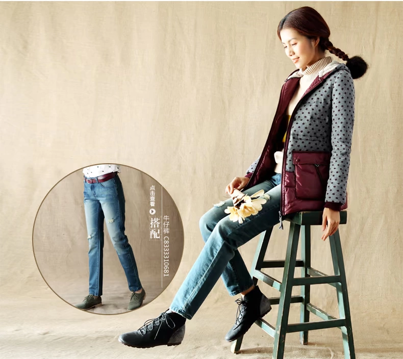 茵曼2014冬装新款棉质波点拼接中长款保暖连帽女羽绒服8341210167