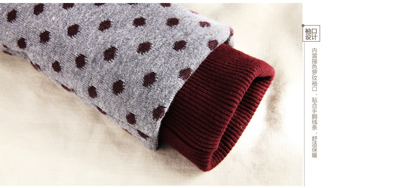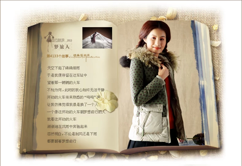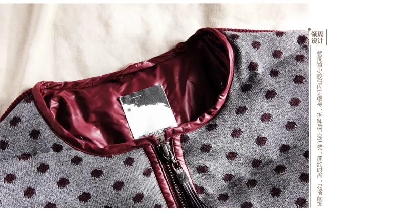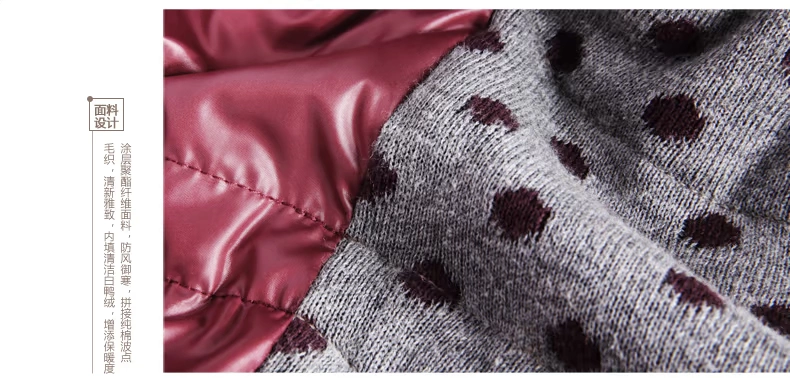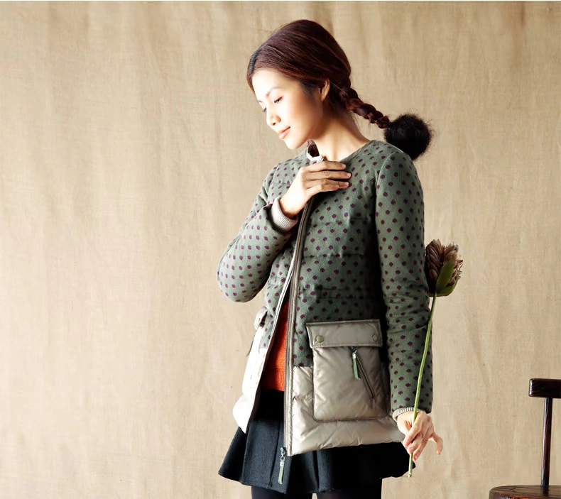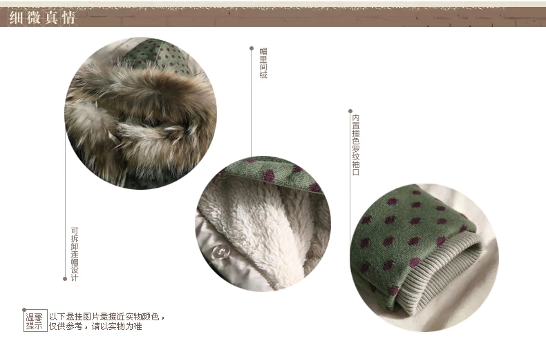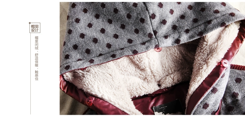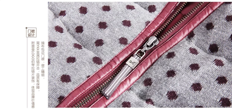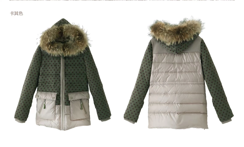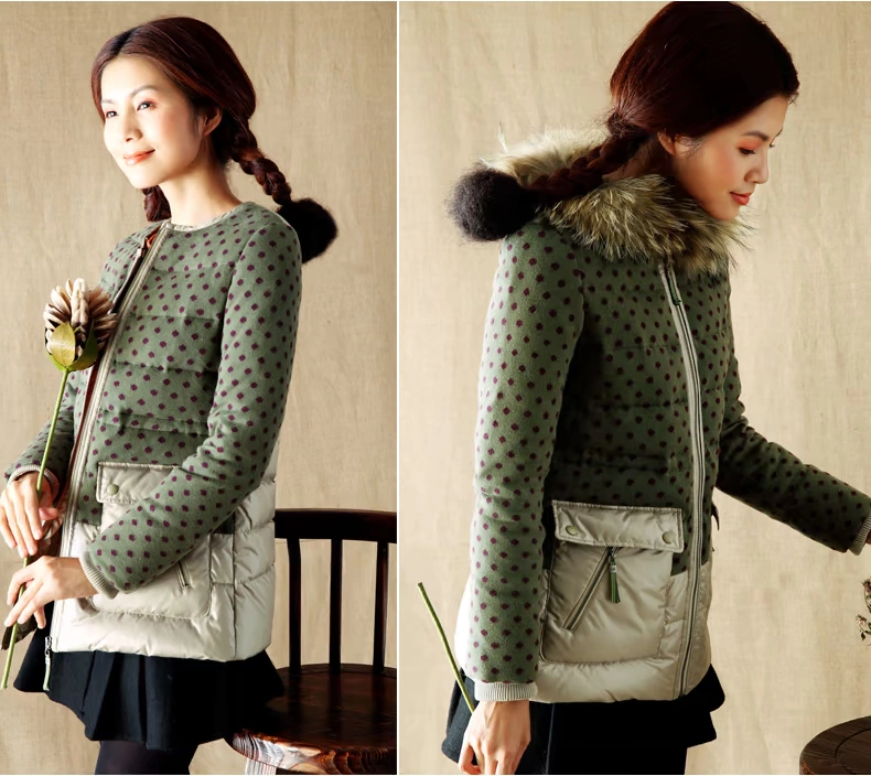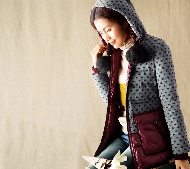 茵曼2014冬装新款棉质波点拼接中长款保暖连帽女羽绒服8341210167
