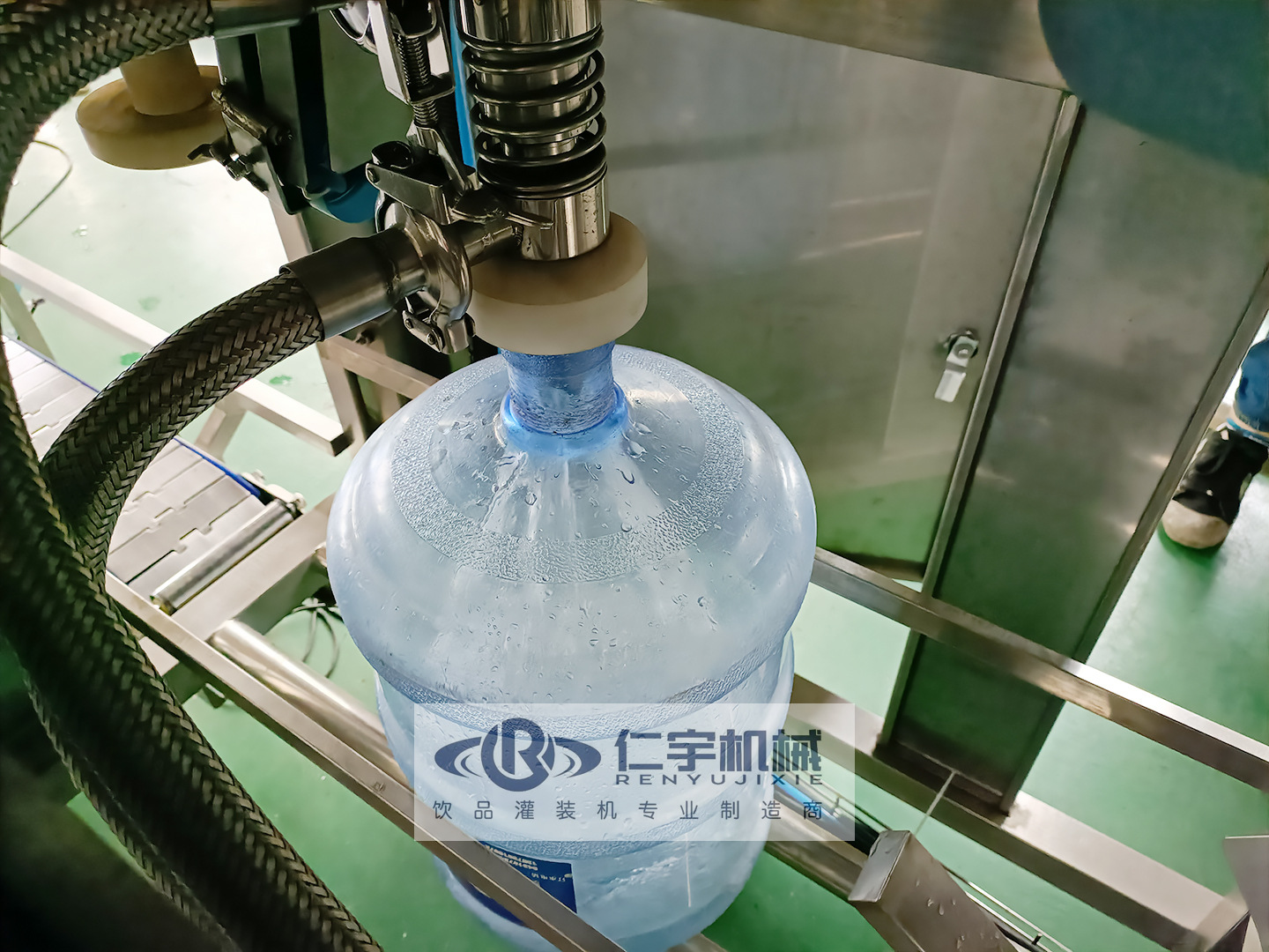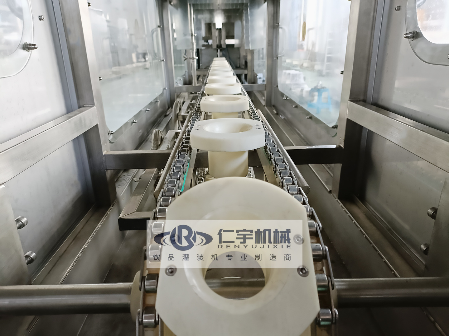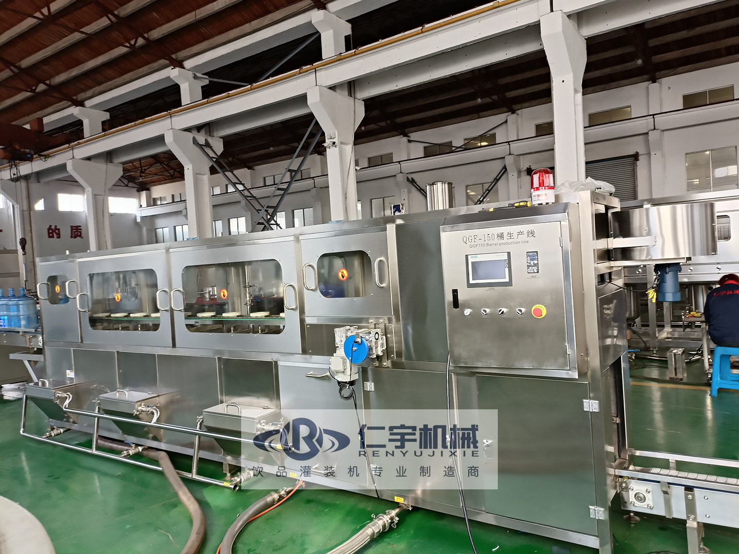 一、 概述微电脑自动洗灌装机是全自动灌装纯净水的设备,也可用于蒸馏水、矿泉水和其它无菌液体的灌装。该设备集洗瓶、灌装、套盖、压盖和成品送出为一体流水线作业,有效地防止纯净水在灌装过程中可能发生的二次污染。该设备采用380V(220V)50HZ交流电,控制系统采用的可编控制系统和气动控制系统编程固化方式,选用高量度数码显示器,操作人员可以根据显示器进行操作。性能可靠、操作方便、维护简单。二、 主要技术参数1、 工作电压:AC220V 、380V (+10%,-10%)50HZ2、 输出能力:24V、9V3、 工作温度:5—45。C4、 工作湿度:40%—95%(不凝露)5、 生产能力150-200桶/h(150-2000桶/时可定制)6、 灌装容量:18.9L(5加仑)7、 桶瓶规格:Φ270×490×Φ568、 桶盖规格:Φ58×409、 电机功率:流瓶水泵370W 380V 220V 50HZ 灌装水泵 750W 380V 220V 50HZ三、 结构特征本机结构分为四个部分:洗瓶部分 灌装部分 可编程控制部分 气动控制部分1、 洗瓶部分:洗瓶部分由洗瓶传动机构,瓶托、药水洗瓶水泵、药水箱、净水洗瓶及灌装水泵、洗瓶传动气缸等组成。2、 灌装部分:由推瓶气缸、推瓶机构、出瓶滚道、灌装气动阀、电磁阀、理盖电机、理盖机构、压盖机构等组成。3、 电气部分:由可编程控制器、交流接触器OUT、PLC等部分组成。四、 工作原理本机采用程序全自动控制、其工作过程如下:1、 洗瓶工位放瓶工位,第二工位采用二氧化氯(CLO2溶液)洗涤消毒,第三工位为纯水冲洗工位,第四工位为沥干工位。2、 灌装:洗干净的瓶,通过洗瓶传动机构的输送、落在推瓶架上,推瓶气缸动做把空瓶推到灌装位置,开始灌装,灌装时间由用根据需要进行调节。3、 套盖和压盖:当灌装结束后,靠下一个灌装瓶将已灌满的瓶子送至理盖机构套盖,套好盖的瓶子推至压盖机构、压盖气缸将瓶盖压紧。至此,一个洗灌周期完成。五、 系统键位说明本电脑提供了12个操作键,每一下都会伴有蜂鸣信号提示,再按一下此键设定关闭。