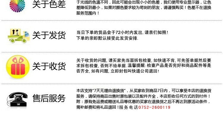 2.请您收货时,当着邮递员的面拆开包装查看是否在运输途中被损坏,确认无误后才签收!如果您急于签收快递公司在运输途中所造成的损坏我们恕不负责!!!