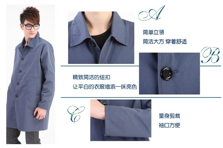| 品 牌:ajiacn(爱家) 货 号:AJ804 尺 寸:定做(公司不备现货,顾客付款后才开始生产订做) 成 分:30%金属纤维 60%棉纤维 10%涤纶 材料采用高新技术精纺而成 |  | | 在男人的世界里,黑灰蓝色等暗色调永远是时尚的宠爱,成为当今商务主流;在造型上用中长款来诠释城市节奏中的新主张;单排扣的设计让衣服整体简约、大气;背后衣身开叉的设计显示出时髦感,翻领成为了本款的亮点,让服装更有质感;让防辐射工服秉承时装的气质,整款风衣低调、时尚、气质内敛。 |  |  | 藏青 |