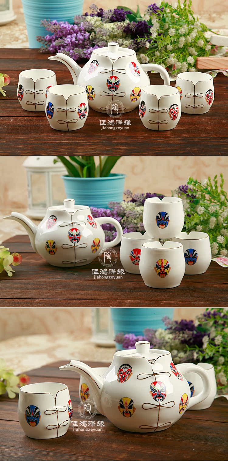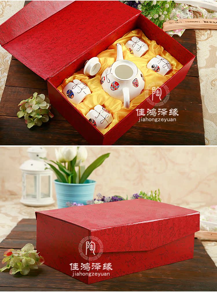 【产品编号】:cj-5-脸谱【产品名称】:脸谱茶具5件套装【产品等级】:一级骨瓷【产品包装】:精装【产品清单】:一个壶、4个茶杯【产品工艺】:骨瓷 耐高温 可用于微波炉