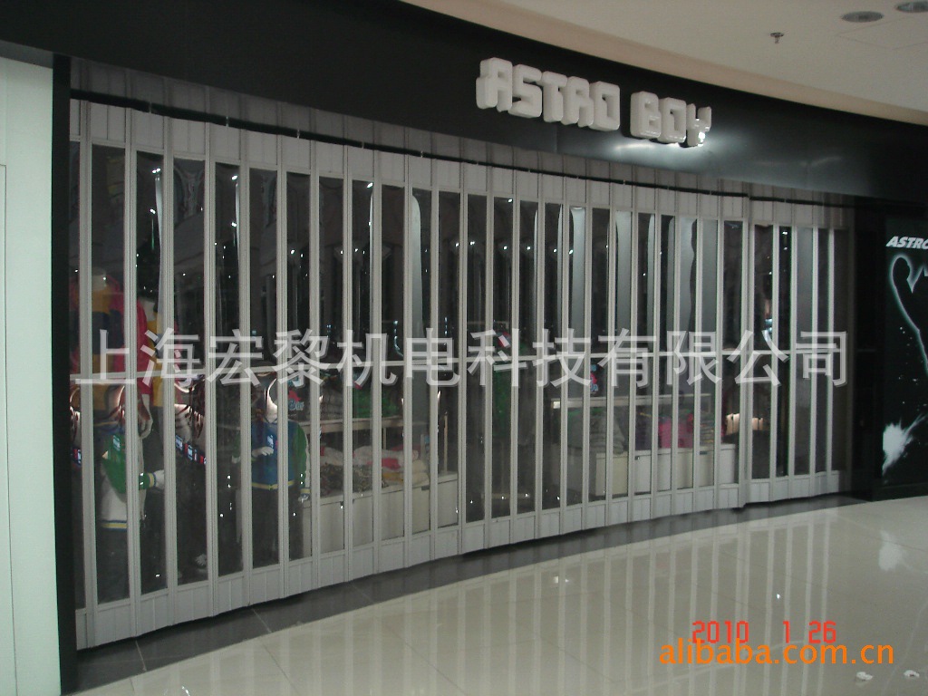 上海宏黎水晶折叠门以独特的产品设计、采用挤压氧化铝合金6063型材,街接具防紫外线低燃性的聚碳酸酯PC板、拥有无可双拟的透视度。可开启每套18米,宽度为220毫米,采用吊轨形式安装,且可不安装地轨。根据客户设计要求,可行走曲线,又不需闸头(少至R800毫米)。是不规则高视野设计的最佳伴侣,为您增加店面气派。绝对是众多不同物业及店铺设计的理想配套选择。侧向水晶折叠门是我公司的新产品,选用高强度pc透明有机板,两侧镶嵌铝合金连接件,可左右折叠,满足您顶部空间不够的需求。通透的特性,尽情的展示您琳琅满目的商品,起到24小时的广告效应。此产品已经在西欧等国家普遍流行。且电动,手动均可。超强度的铝合金设计,使得我们的门最宽可以做到36米宽。