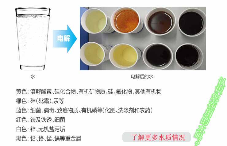 3. 由于电流的作用,原来溶于水中的金属粒子,如锰、钾、钴等还原出来,并逐渐聚集形成金属团,由于不同金属离子的显色不同,从而产生颜色的分离。电解后的水出现不同颜色显示出水中各类杂质。