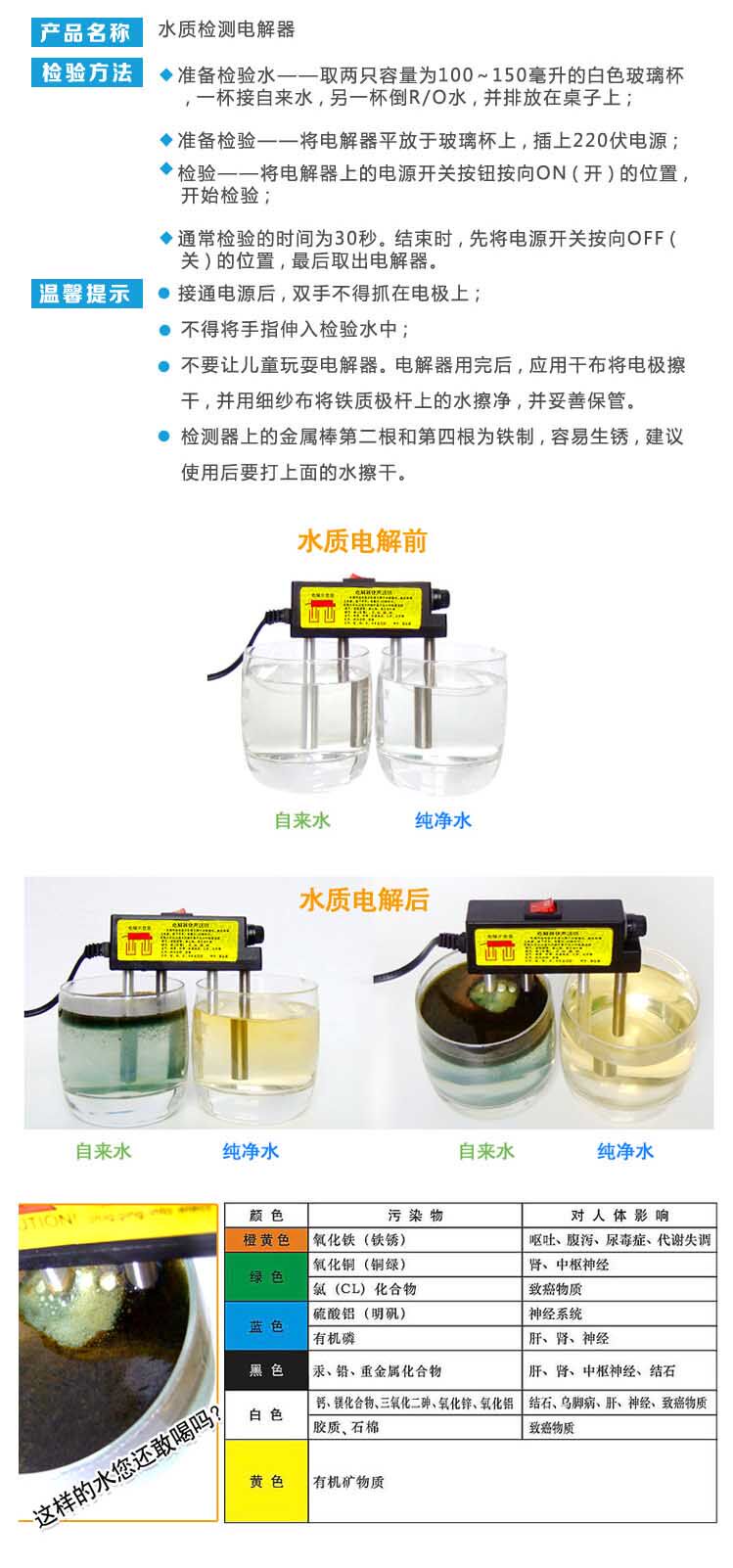 1. 水质电解器也叫固体沉淀促进仪,是美国食品医药管理局(F.D.A),认定用来对已经被污染的水进行基本判定的简易的水质检测方法,对于需要检验水源纯净时很有实际意义,可使用户清楚、直观地看到自己日常所饮用水的实际情况。