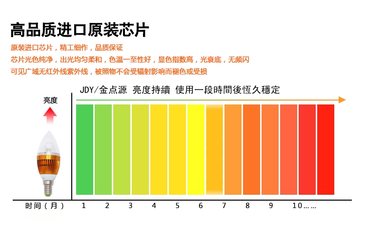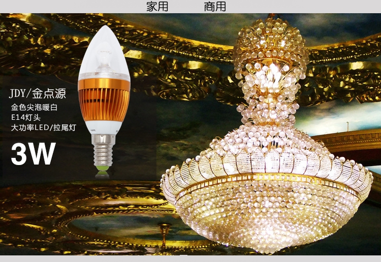 【品 牌】 :金点源 JDY-LED 【产品名称】 :LED灯泡 蜡烛灯 【型 号】 :JDYLED-LZD3W8 【规格】:接口:E14 尖泡 直径:38MM 高:105MM 拉尾 直径:38MM 高:130MM