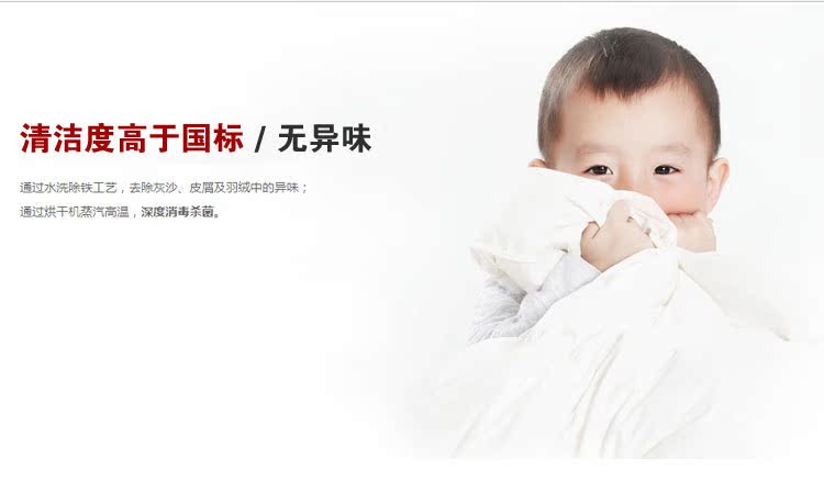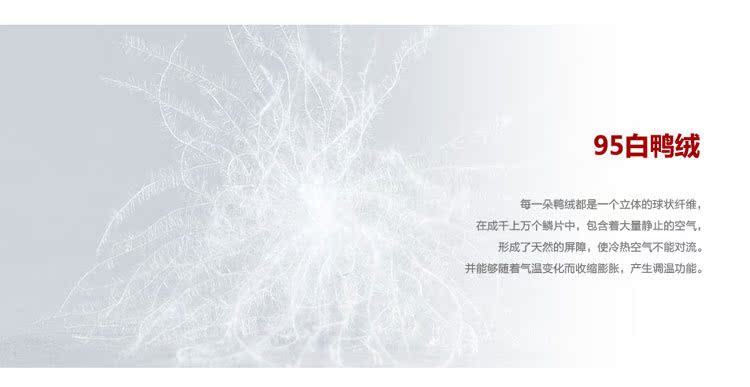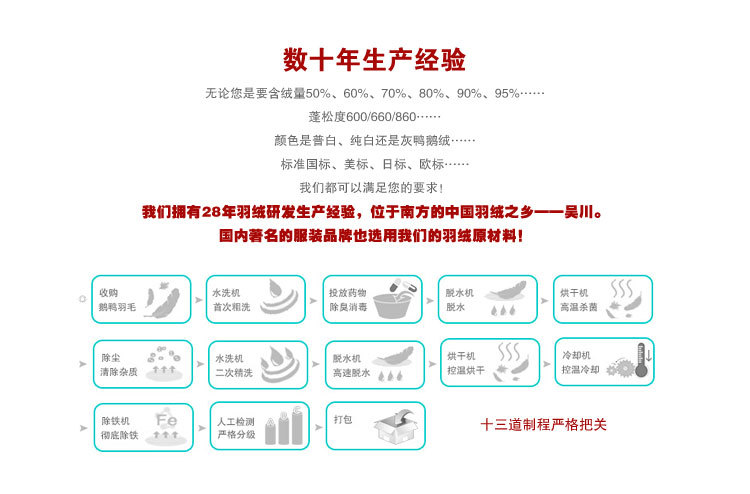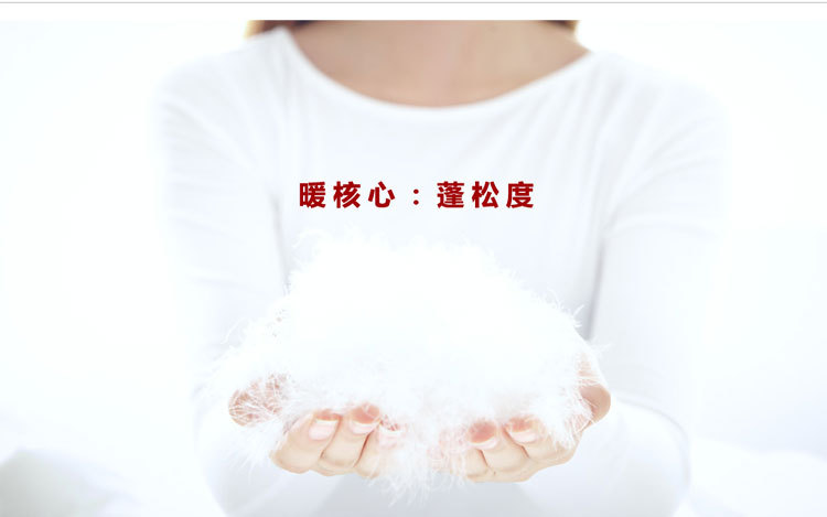 产品功能:采用的羽绒经过分类、高温、抗 菌、防霉、除臭等处理,使用环保可降解的生物洗涤剂清洗,绿色环保工艺始终贯穿于产品及原料的整个制造过程,羽绒具有清新、收缩、膨胀、保暖、吸湿、自然调节和改善人体生理机能等特性,手感柔软舒适并具有较好的防水、透气功能。