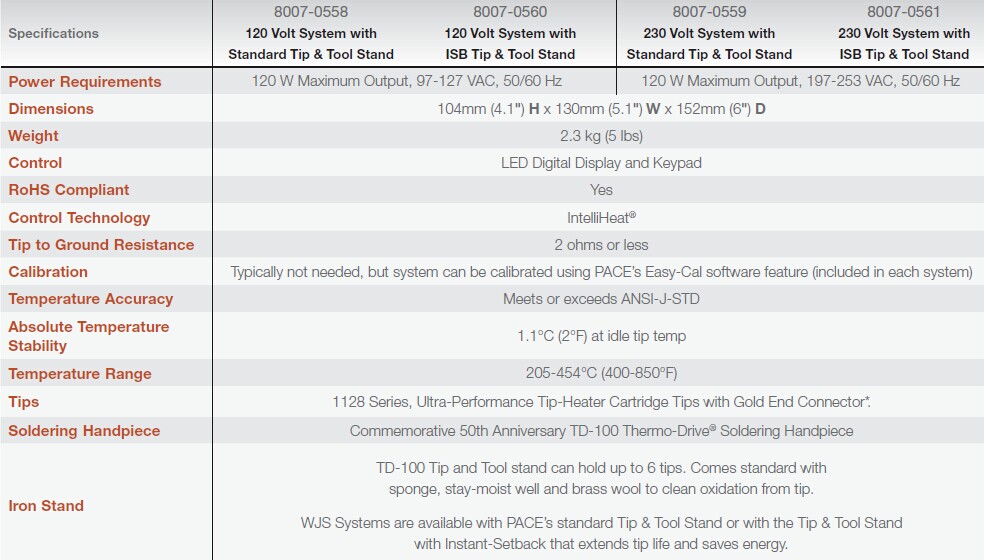 The WJS 100 comes standard with a special anniversary edition of PACE’s renowned TD-100 Thermo-Drive® Handpiece,considered by many to be the most comfortable soldering handle available.
