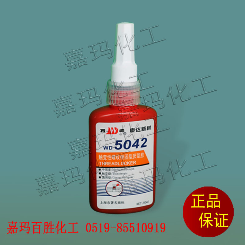 “万达”牌WD5042厌氧胶为通用型、中强度、触变性厌氧胶,用于M6-M20螺纹的锁固和密封,耐介质性能好。 WD5042厌氧胶的技术性能与乐泰LT242相当。