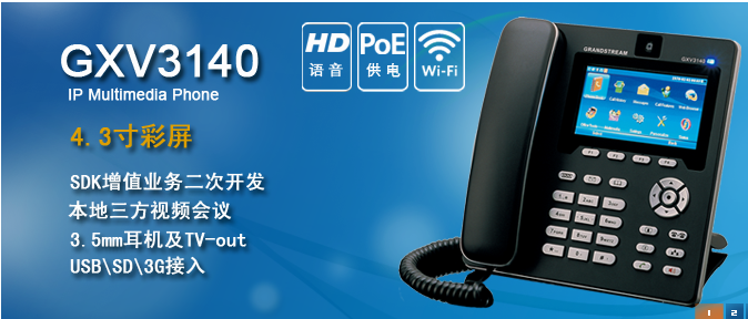 GXV3140采用优雅的外观设计,领先的技术,提供高保真、高清晰语音和视频质量,操作简单,与第三方SIP产品有良好的互通性,是家庭和企业用户IP视频通信的理想选择。它配备一块高清晰的4.3英寸的数字彩色液晶显示屏,带来丰富的语音、视觉体验和丰富的多媒体应用。同时具备可高度定制的SDK开发接口能为客户实现创新的第三方增值应用和定制。