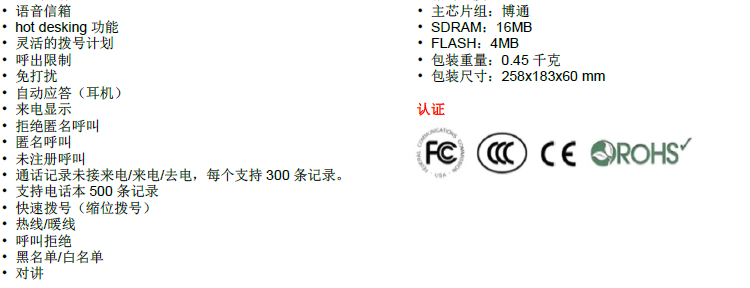 - Call control features: flexible dial map, hotline, empty calling no. reject service, black list for reject authenticated call, white list, limit call, no disturb, caller ID