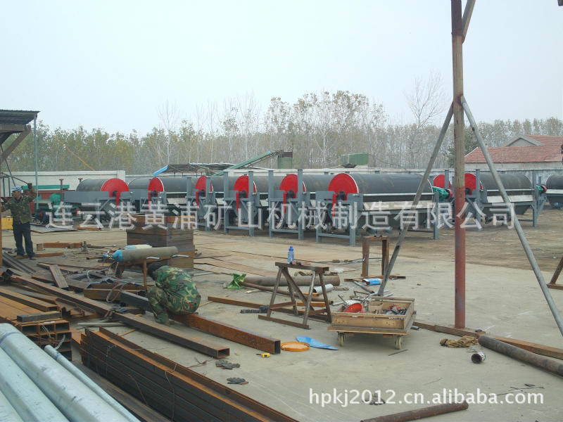 矿浆经给矿箱流入槽体后,在给矿喷水管的水流作用下,矿粒呈松散状态进入槽体的给矿区。在磁场的作用,磁性矿粒发生磁聚而形成“磁团”或“磁链”,“磁团”或“磁链”在矿浆中受磁力作用,向磁极运动,而被吸附在圆筒上。由于磁极的极性沿圆筒旋转方向是交替排列的,并且在工作时固定不动,“磁团”或“磁链”在随圆筒旋转时,由于磁极交替而产生磁搅拌现象,被夹杂在“磁团”或“磁链”中的脉石等非磁性矿物在翻动中脱落下来,最终被吸在圆筒表面的“磁团”或“磁莲”即是精矿。精矿随圆筒转到磁系边缘磁力最弱处,在卸矿水管喷出的冲洗水流作用下被卸到精矿槽中。非磁性或弱磁性矿物被留在矿浆中随矿浆排出槽外,即是尾矿。