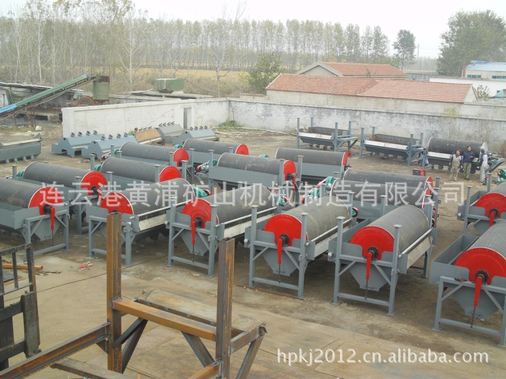 磁选机适用于湿式选别细颗粒的强磁性矿物,或者除去非磁性矿物中混杂的强磁性矿物。本机可以连续给矿和排矿,磁场深度大,工作间隙大,具有较高的处理能力。其原理是当矿浆进入磁场区时,其中强磁性矿物被吸附在圆筒表面,弱磁性和非磁性矿物被甩掉排出,而吸附在圆筒表面上的强磁性矿物随圆筒旋转,被带出磁场区,用冲洗水冲入精矿槽中,完成分选作业。