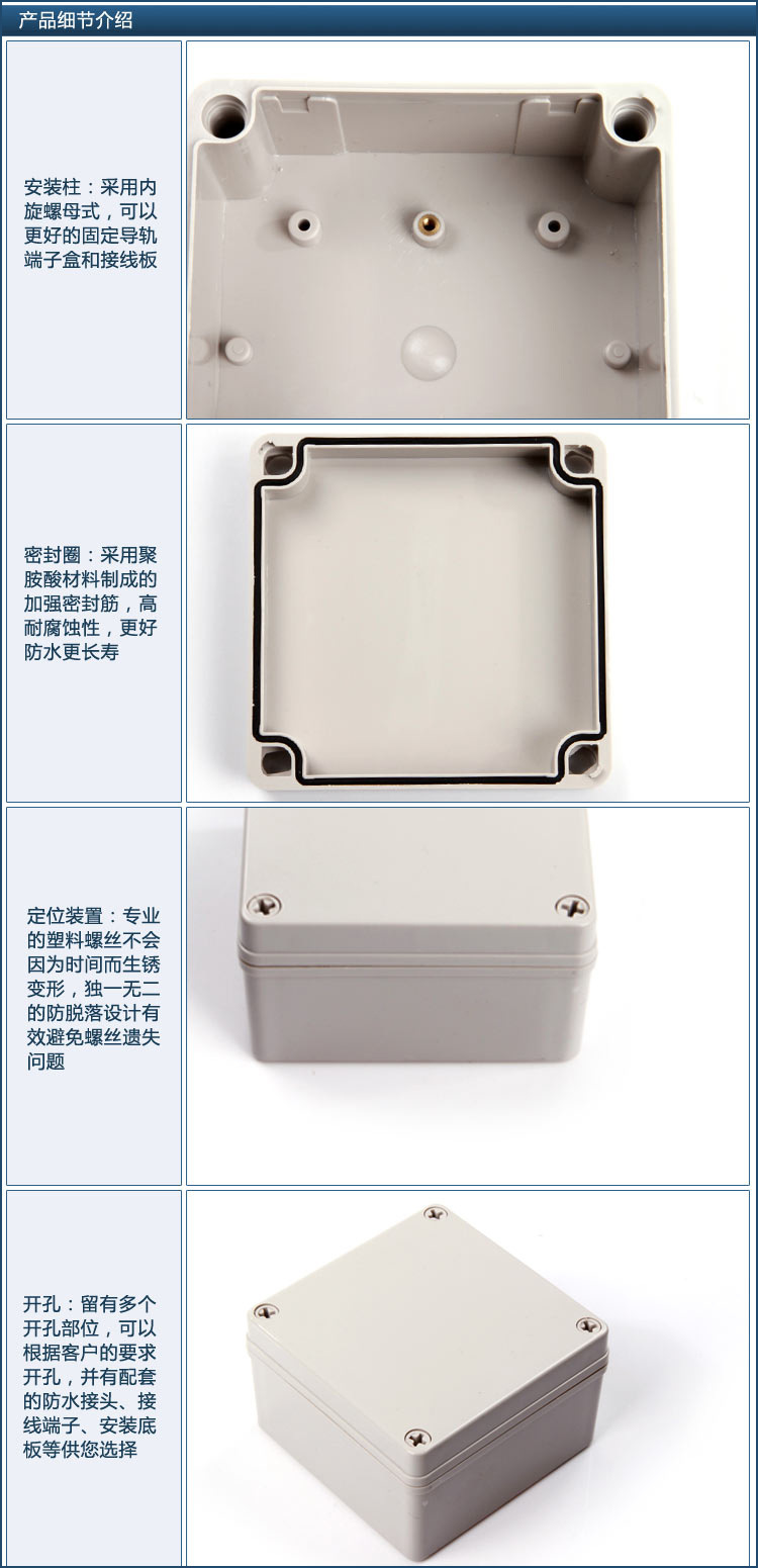 材质 | 采用台湾进口的新料,优质的热塑性塑料ABS及PC制成,还 可以根据客户的要求来选择材料,可订做阻燃料,防紫外线 材料的箱子,上盖有透明与不透明两种形式(材料耐腐蚀, 防静电,绝缘性佳)。 |